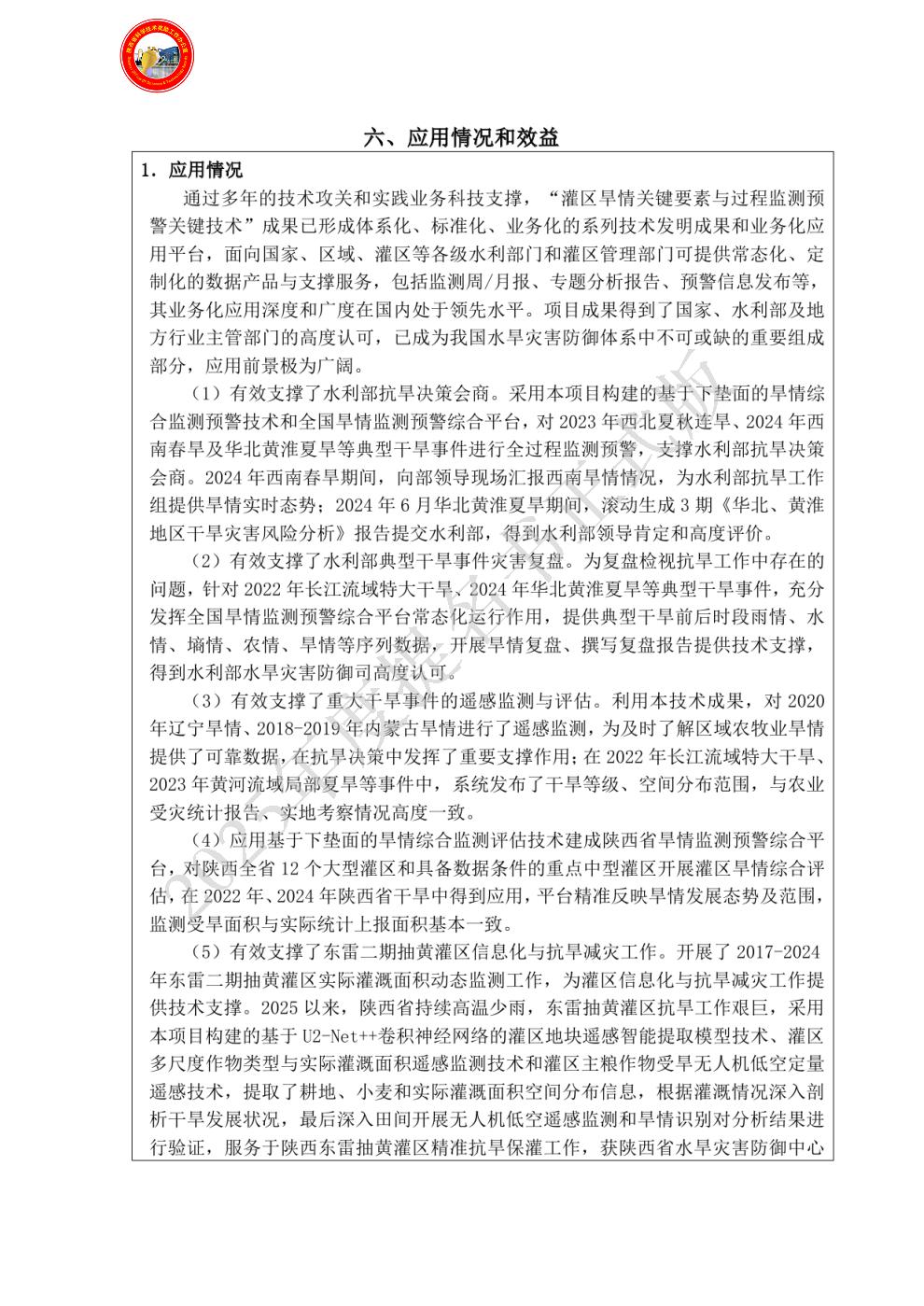 该项目技术成果是水旱灾害防御从被动应对转向主动预警的标志性成果,为我国数字孪生灌区建设、高标准农田水利现代化管理提供了核心关键技术支撑,应用前景广阔,整体效益显著,完全符合报奖要求。推荐“灌区旱情关键要素与过程监测预警技术”参加2025年陕西省技术发明奖申报。