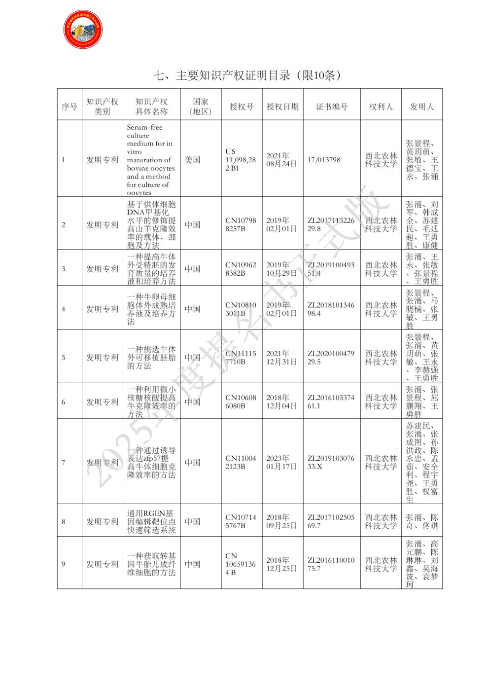 排名:3 行政职务:无 技术职称:教授 工作单位:西北农林科技大学 完成项目时所在单位:西北农林科技大学 对本项目技术创造性贡献:对技术发明点1、2、3均有重要贡献。长期从事家畜胚胎工程和生物育种理论和技术研究,系统解析牛羊胚胎发育调控机制,创建牛羊高效体细胞克隆技术体系、克隆了一批顶级牛羊种质资源;建立了标准化体外胚胎生产技术体系,大幅提升牛羊良种培育效率;创新牛羊基因编辑育种技术,创制了一批基因编辑牛羊新种质。附件1.1.2、1.1.3、1.2、2.2.1、2.2.2、2.2.3、2.2.17、2.2.22。