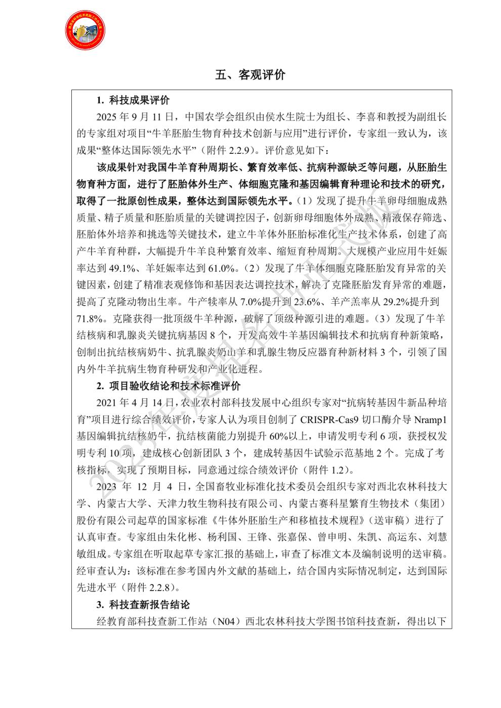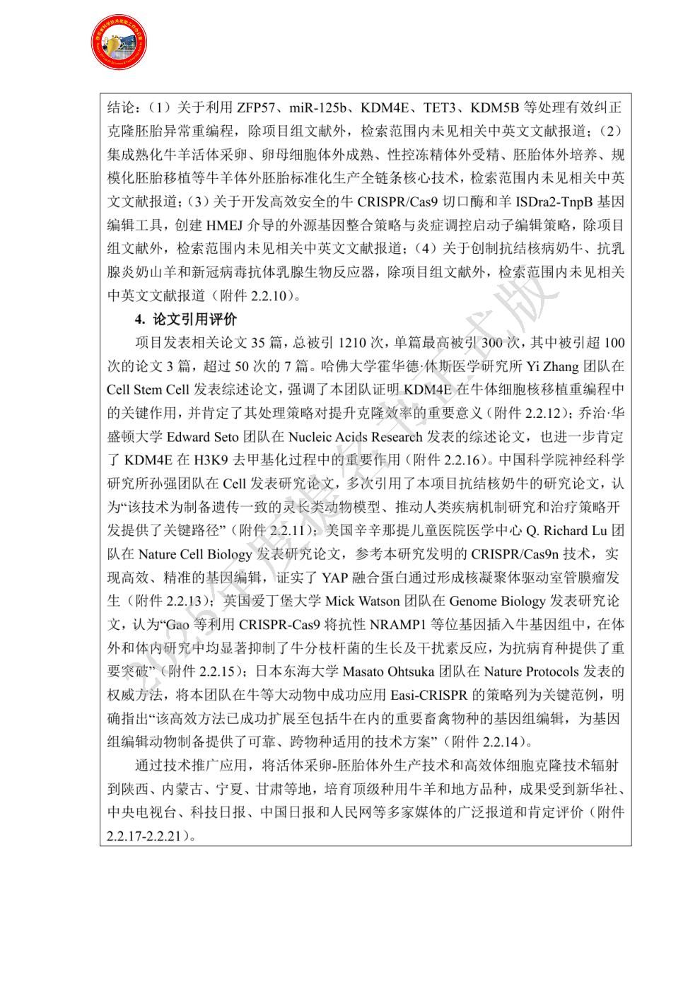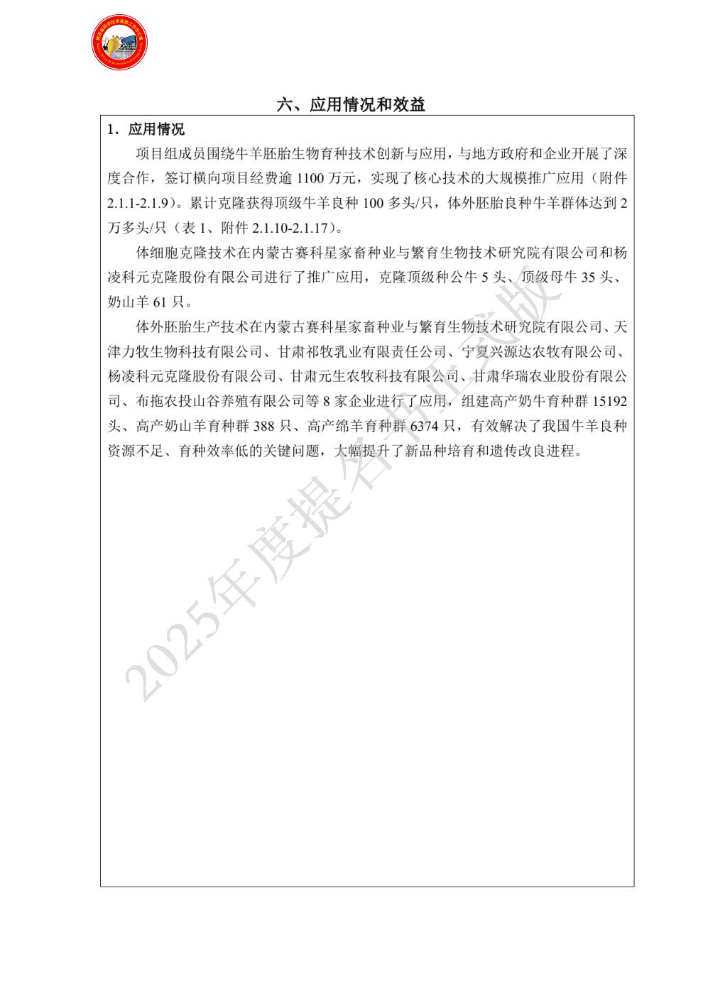 | 提名单位意见: | 种业是国家战略性基础性核心产业,畜禽良种已成为畜牧业高质量发展的核心要素。当前我国牛羊种业“卡脖子”问题严重。以体外胚胎生产、体细胞克隆和基因编辑技术为代表的新一代生物育种技术能够大幅缩短育种周期、快速创制性状突出的新种质,已成为家畜种业科技创新的研究前沿和战略制高点。该项目在国家科技重大项目、国家自然科学基金重点项目和面上项目等资助下,以提高牛羊繁育效率、创制牛羊新种质为目标,聚焦破解牛羊胚胎生物育种技术的关键卡点,建立牛羊标准化体外胚胎生产技术体系,快速组建了高产牛羊育种群;建立了高效牛羊体细胞克隆技术,显著提升克隆动物的出生率,创制了一批牛羊顶级种质资源;研发高效安全的牛羊基因编辑工具与策略,创制了一批抗结核病、乳腺炎牛羊育种新材料,并获得生物安全评价证书。项目获批发明专利14项、软件著作权3项,发表SCI论文35篇,编制著作1部,制定国家标准1项。相关成果得到新闻媒体的广泛报道以及同行的高度评价。研究成果对提升牛羊育种效率和种质创新水平发挥了重要作用,产生了显著的经济和社会效益。
