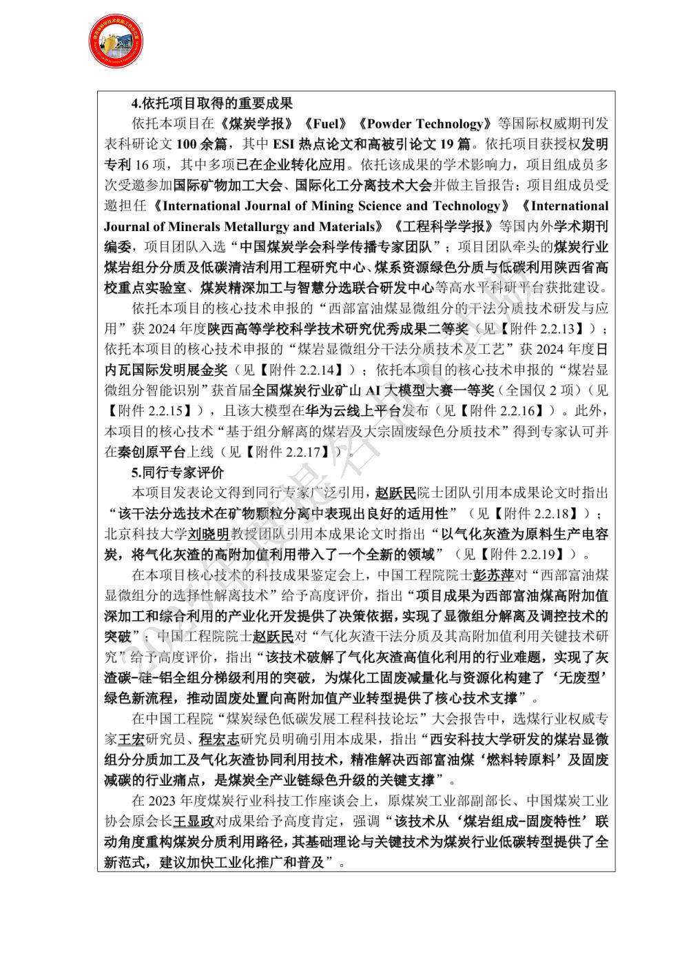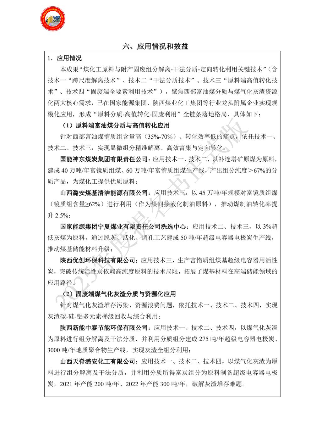 单位贡献:作为项目核心技术研发与理论创新的牵头单位,西安科技大学立足矿山工程技术、化学工程技术交叉领域,以解决煤炭清洁高效利用核心难题为导向,发挥基础研究、技术创新与技术应用推广引领作用。在科技创新方面的贡献包括:①基础理论奠基,以组分分选理论和过程工程方法为核心,系统研究富油煤显微组分嵌布特性、气化灰渣有价组分连生规律,揭示不同组分对施力方式的响应机制,构建“连续组分域的解聚”理论模型,为跨尺度解离、干法分质技术提供核心理论支撑。②核心技术突破,牵头研发“跨尺度解离技术”,创新宏观-微观耦合解离模式,攻克富油煤有机组分与煤气化灰渣有价组分高效解离瓶颈;主导“干法分质技术”研发,自主设计组分分质系统,实现富油煤及灰渣中组分的定向富集,破解西部缺水地区湿法分选局限。③技术体系构建,整合原料端与固废端技术需求,开发原料端高附加值转化与固废端梯级利用关键技术,形成“跨尺度解离-干法分质-定向转化利用”全链条技术体系,为技术工业化奠定核心基础。在应用推广方面的贡献包括:①牵头组织技术成果鉴定,推动该项目多项核心技术通过行业权威机构认定,支撑成果获得“国际领先”等评价。②通过中国工程院行业论坛、煤炭科技峰会等平台发布理论成果与技术进展,推广“原料-固废”全链条绿色利用理念,提升技术行业影响力。③联合企业开展技术培训与人才培养,输出技术实操成果,为技术落地提供理论与实操双重指导。