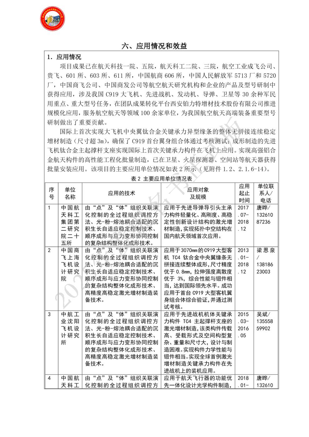 单位贡献:作为项目第二完成单位,负责激光增材制造成果应用转化和工程化装备中涉及到的关键技术的研究、改进和实施工作,对发明点四做出了创造性贡献。