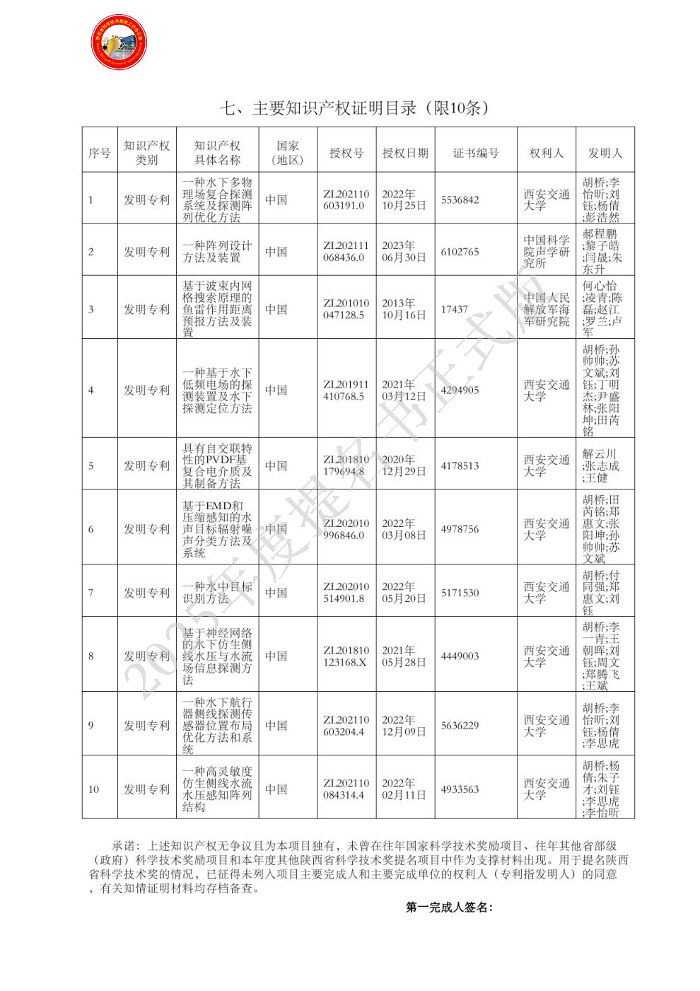 排名:1 行政职务:院长 技术职称:教授 工作单位:西安交通大学 完成项目时所在单位:西安交通大学 对本项目技术创造性贡献:该完成人是项目总体负责人,制定了项目总体方案与具体实施计划,主持了该项目理论研究、技术开发和探测系统研制等工作,是发明点1、2的重要贡献者和发明点3的核心贡献者。创新提出了海洋高端装备声电流多物理场目标主被动联合新型检测理论模型及智能识别系统,开发了多物理场探测相关软件系统,为突破水下弱小目标精确探测中的瓶颈问题奠定了基础。在本领域获得授权发明专利20项,软著3项,发表论文28篇,撰写专著1部,主持国家及省部级项目15项。佐证材料:附件1,4,15,18,20,22-26,28-31,38-40,44,47,48。