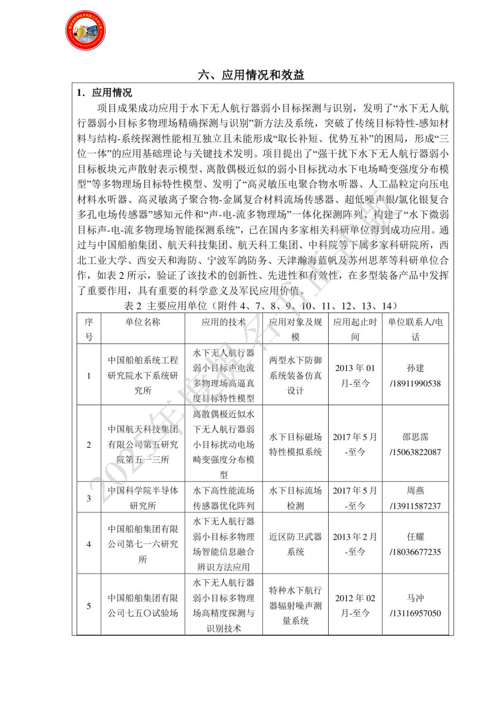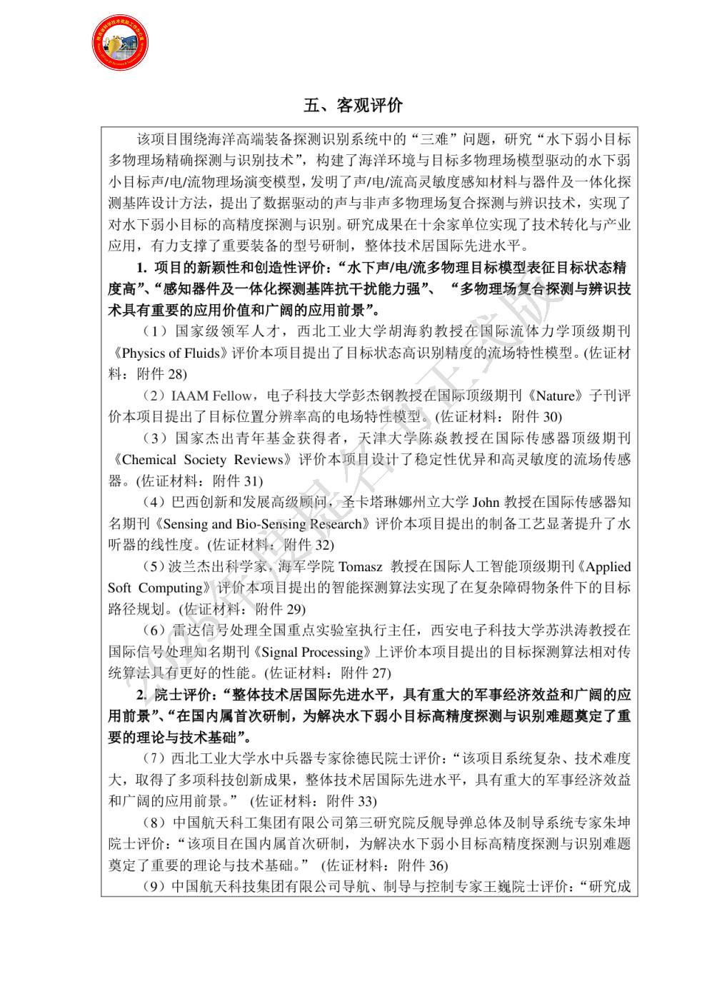 该项目发明了水下声/电/流多物理场目标特性一体化高精度建模技术,提出了水下高性能声与非声探测传感器及阵列布局优化设计方法,构筑了水下声/电/流多物理场目标主被动联合检测及智能识别系统。项目系统复杂、技术难度大,取得了多项科技创新成果,实现了水下无人航行器弱小目标多物理场精确探测与识别核心技术自主可控,整体技术处于国际先进水平。研究成果为突破复杂海洋环境下弱小目标高精度探测与识别瓶颈问题奠定了重要技术基础,在诸多单位实现了核心技术转化与产业应用,具有重大的经济社会效益和广阔的应用前景。