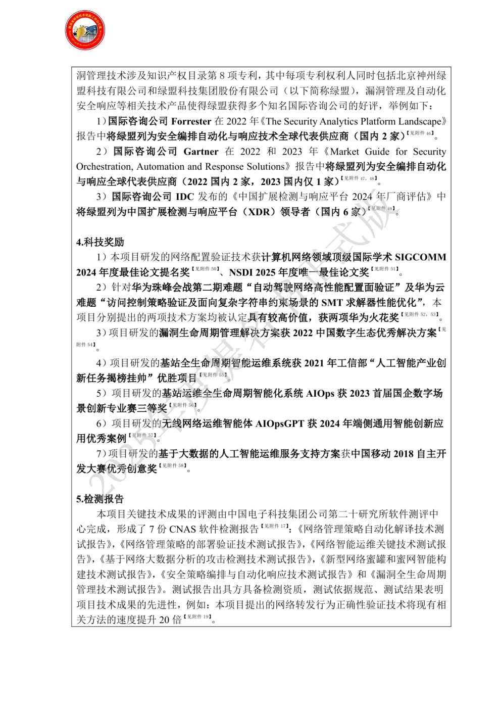单位贡献:作为项目第二完成单位,是主要知识产权目录第8项专利的权利人,重点负责了网络流量分析、日志分析、漏洞全生命周期管理及漏洞扫描、自动化编排响应等技术的研发。基于该技术研发的系统具备自动化响应能力,资产漏洞联动查询能力以及全局与内部终端主机相结合的自动化响应验证能力,并支持0Day漏洞管理和风险评估,相关技术落地应用于北京神州绿盟科技有限公司ISOP软件平台、TVM平台及RSAS产品,相关技术产品取得了较好的市场推广应用。