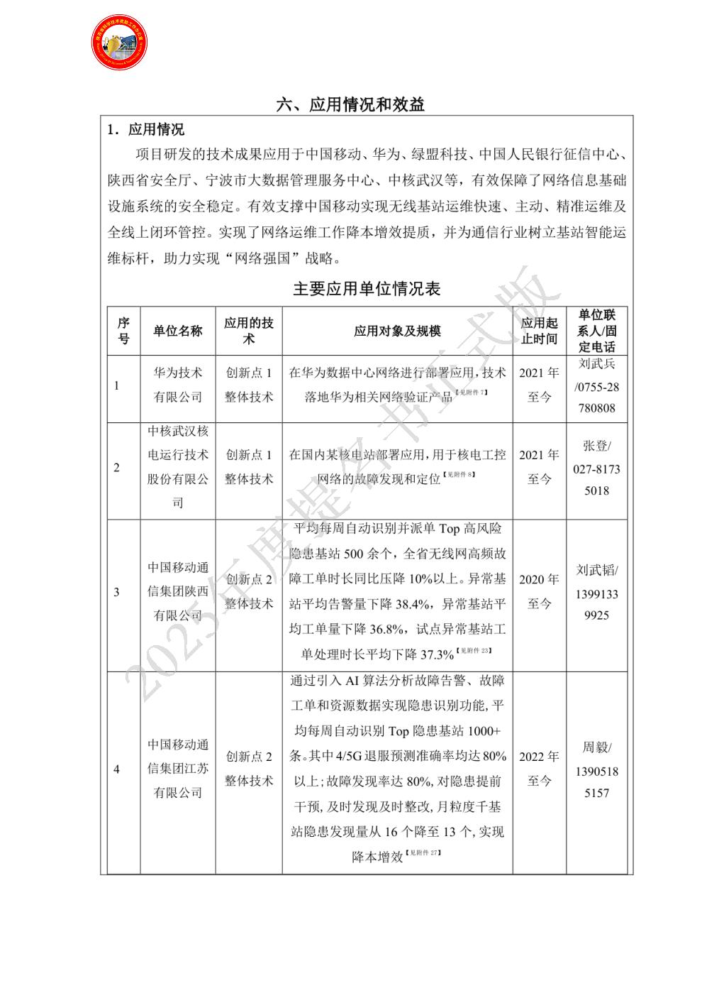 单位贡献:作为项目第三完成单位,是主要知识产权目录第9,10项专利的权利人,重点研究AI技术及网络运维需求,提出智能网络运维方法论,构建以决策智能为核心的无线运维技术体系,发明了基于多变量时序分析的基站态势智能感知技术、基于多维时空信息挖掘的智能分析技术、基于知识增强的处理方案智能推荐技术等;研发基站全生命周期智能运维系统AIOps,首次实现基站运维的全流程自动化、智能化闭环管控。推动以决策智能为核心的无线运维应用在全国26省大规模部署,赋能4G/5G基站实现智能化运维应用,推动“自智网络”建设。