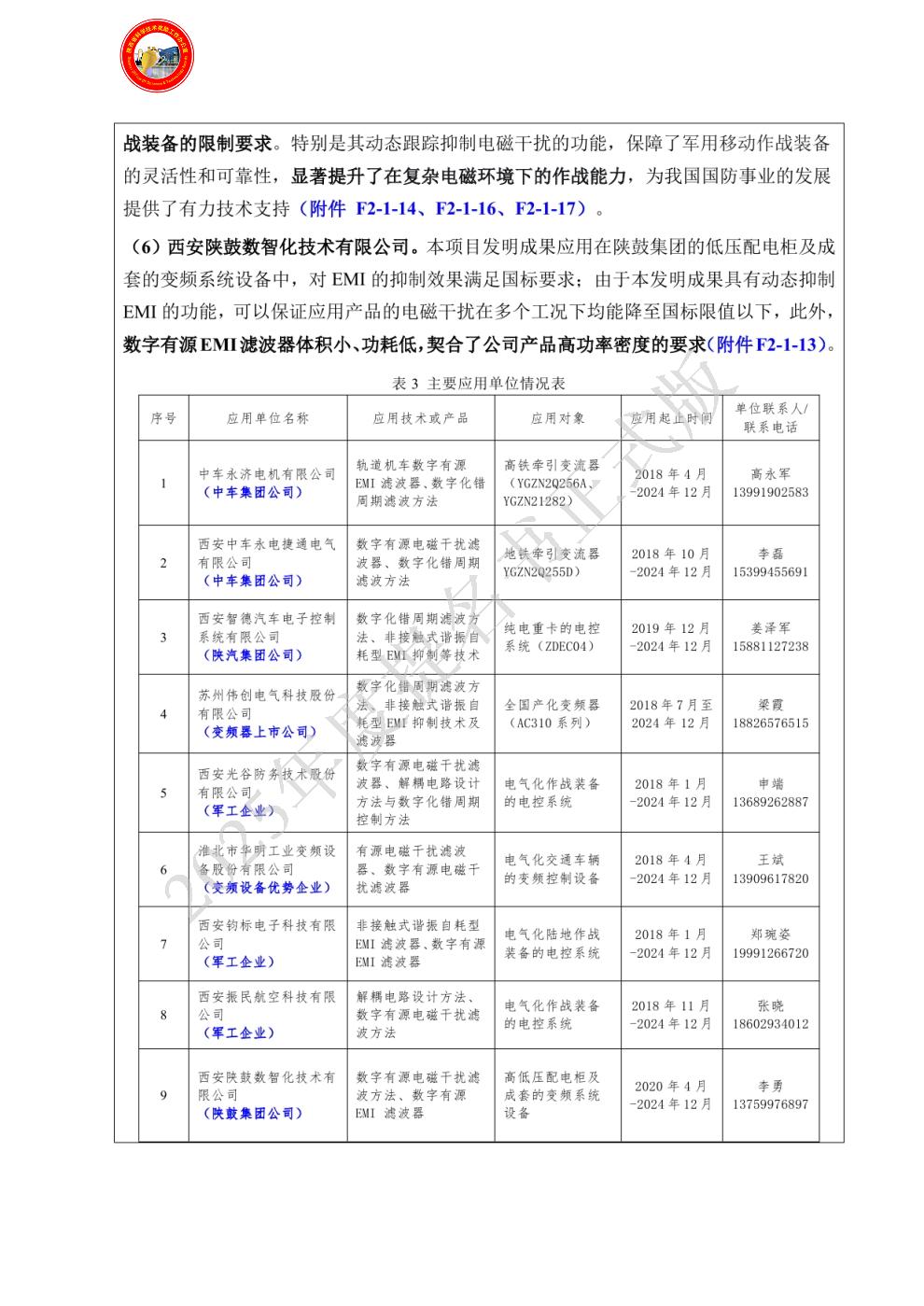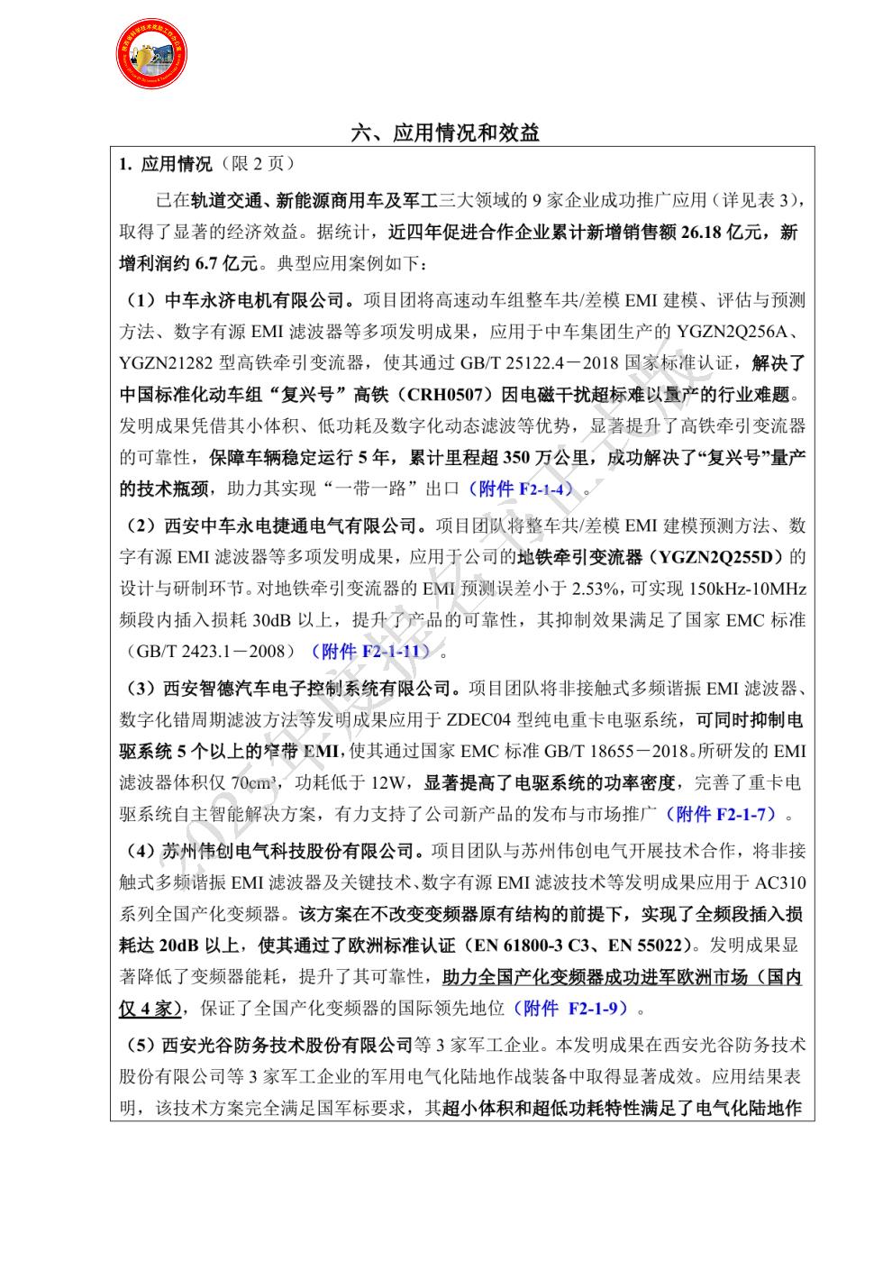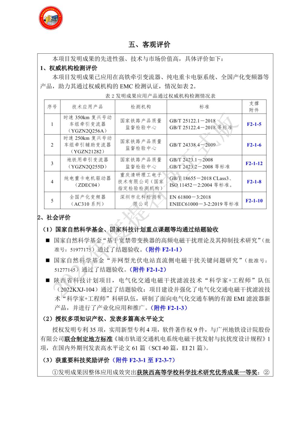 提名项目授权发明专利35项,实用新型4项,软件著作权9件,发表论文61篇,先后获得陕西高等学校科学技术研究优秀成果一等奖、中国节能协会节能减排科技成就奖等7项奖励。提名成果已在多家企业产业化应用,攻克了多项电磁干扰难题,产生了显著的应用成效,包括:1)支撑时速250km、350km中国标准化动车组通过国标认证,实现量产及出口;2)解决纯电重卡电驱系统多频段窄带干扰超标难题,推动纯电重卡产业化落地;3)助力全国产化变频器满足欧洲标准,进军欧洲市场;4)保障某军用电气化作战装备电驱产品通过国军标认证,提升可靠性与特种作战能力。为陕西省、西安市重点产业链(重卡、轨道交通)的发展发挥了重要作用,为国家“双碳”战略目标的实现做出了贡献。