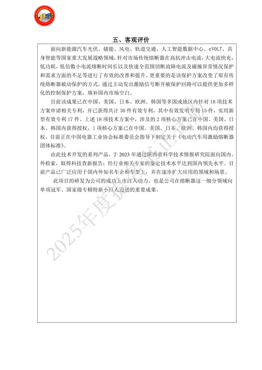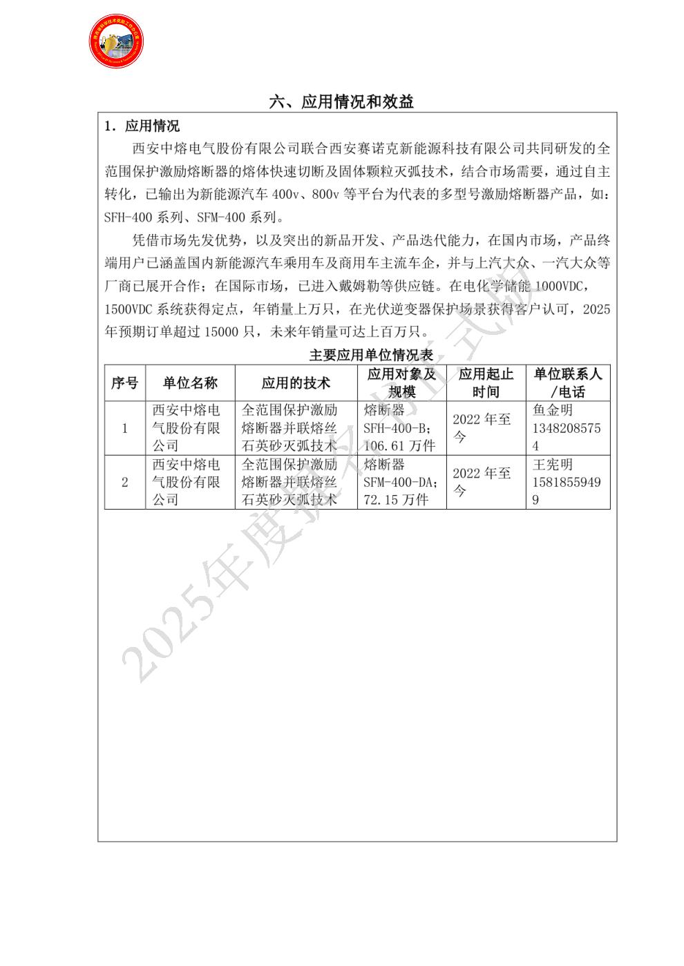 单位贡献:科技创新:1.针对此项目,为应对行业内此类产品试验检测平台的空白,搭建独立试验检测中心,加强资金保障,目前该试验检测中心已通过CNAS认证,确保项目落地,形成产品核心竞争力,提高客户认可度。2.知识产权与技术储备:以并联有熔体,同时形成多断口相关技术方案的为基础,从保护原理、核心材料、具体结构等方面出发,各维度进行优化设计,形成一组基于该项目的国内外专利组合,构建行业技术壁垒。3.注重人才培养,建立完备的人才激励机制,培养出一支“电气设计+材料研发+可靠性分析+测试验证”的专业团队。4.成立先进制造中心,为项目工艺、零部件加工提供保障和支持。5.产品完成外危险品等级鉴定、欧盟CE认证、德国BAM存储认证、美国DOT认证。应用推广:1. 认证与合规:扫清市场准入障碍。已通过IATF16949汽车行业质量管理体系、ISO/TS22163轨道交通行业质量管理体系、ISO9001质量管理体系等认证,是目前国内电力熔断器领域质量体系及产品安全认证最为齐全的企业之一。2.搭建海外营销团队,扩宽产品商业版图;3. 技术服务与售后保障:为提升客户粘性,建立“售前-售中-售后”全周期服务体系,确保产品稳定应用,让技术从实验室走向市场,最终为新能源汽车的用电安全提供关键支撑。实现了“科技创新-市场应用-行业引领”的闭环,推动了能量保护领域的技术进步与产业升级。