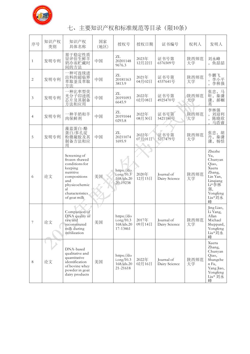 排名:1 行政职务:主任 技术职称:教授 工作单位:陕西师范大学 对本项目技术创造性贡献:项目负责人。建立了产地+奶源+贮运+加工的羊乳安全生产各环节营养控制新方法、基于PCR+LAMP+分子印迹+DSC的羊乳安全生产各环节质量控制新方法、基于营养安全控制+活性物质功效评估的羊乳功能产品高效开发新方法,开展了整个技术示范推广。获知识产权15项,发表论文54篇(SCI收录29篇),对3大创新点做出创造性贡献。(必备附件1-1;其他附件1-12、14、17、18,2-3~5,2-7,2-10~12论文1~8、11~14、22~26、31、35、36、46~62、64~68、75~81、100~104,2-13,2-14知识产权1、12~15、21~30,2-20~23,2-26~30) 曾获国家科技奖励情况:1)主持的“羊乳安全生产与质量控制及产业化示范”项目成果,2023年获陕西高等学校科学技术研究优秀成果奖,特等奖,1/11;2)主持的“优质牛奶安全生产、评估及其活性物质综合利用研究与示范”,2018年获陕西省科学技术奖,二等奖,1/9,证书号2018-2-014-R1;3)主持的“基于智能DHI测定的牛奶品质提升研究与示范”,2021年获陕西农业技术推广成果奖,二等奖,1/23,证书号2021-02-15。 - 姓名:李林强