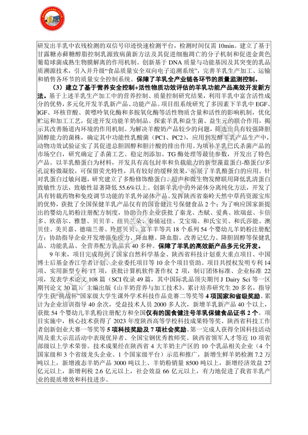 | 提名单位意见: | 项目针对我省羊乳产业发展中还存在的技术问题,利用食品科学与工程、营养学、分子生物学等学科交叉优势,重点围绕营养强化控制、质量监测控制、高效产品开发3大方向开展了创新研究,建立了基于产地+奶源+贮运+加工的羊乳安全生产各环节营养控制新方法,建立了基于PCR+LAMP+分子印迹+DSC的羊乳安全生产各环节质量控制新方法,建立了基于营养安全控制+活性物质功效评估的羊乳功能产品高效开发新方法,形成了羊乳安全生产与质量控制及产业化示范技术体系,为加快羊乳营养、安全、高效生产提供了科学依据。项目完成得到了国家自然科学基金、陕西省科技计划重大重点项目等项目资助,共授权发明专利14项、实用新型专利17项,获批计算机软著2项,制订团体标准、企业标准22项,发表学术论文108篇,主编出版《山羊奶营养与加工技术》。累计培养研究生20多名,指导学生获4项国家和省级奖励,核心技术获得了2023年度陕西高等学校科技成果特等奖等5项科技奖励。开发羊乳新产品40个以上,获批全国仅有的2个国食健注号羊乳保健食品证书。技术成果经在陕西省4大羊奶主产区的10个乳品相关企业示范推广,新增经济效益近30亿元,有力地促进了我省羊乳产业的提质增效和科技进步。