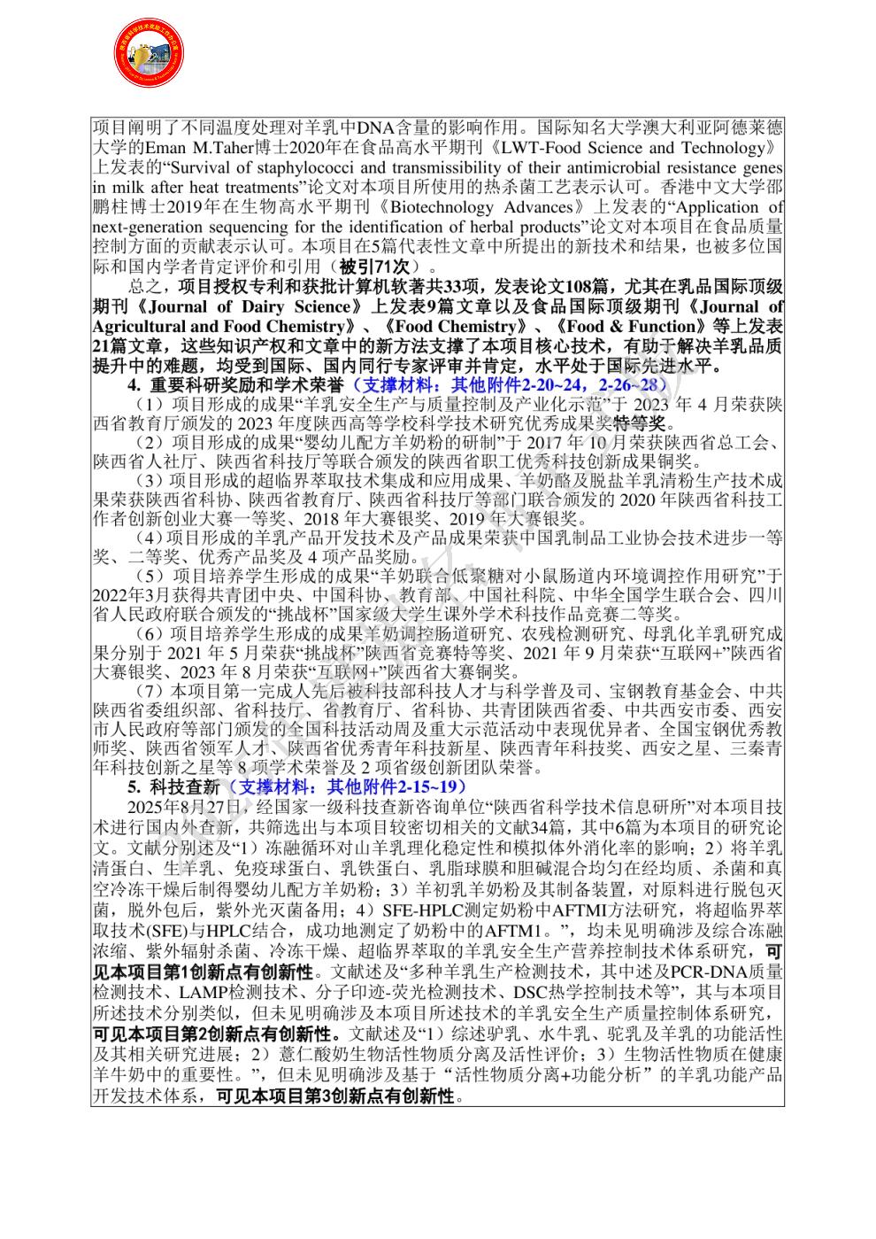 3)在项目成果完成中对第3 项创新点均做出了创造性贡献,主要开展了秦岭中草药功能因子分析,组方配伍,开发了首个羊乳保健食品、多个特殊医学羊乳食品、特殊膳食羊乳食品、功能配方羊乳粉等羊乳产品,建立了基于营养安全控制+活性物质功效评估的羊乳功能产品高效开发新方法。并进行了相关技术的示范推广。