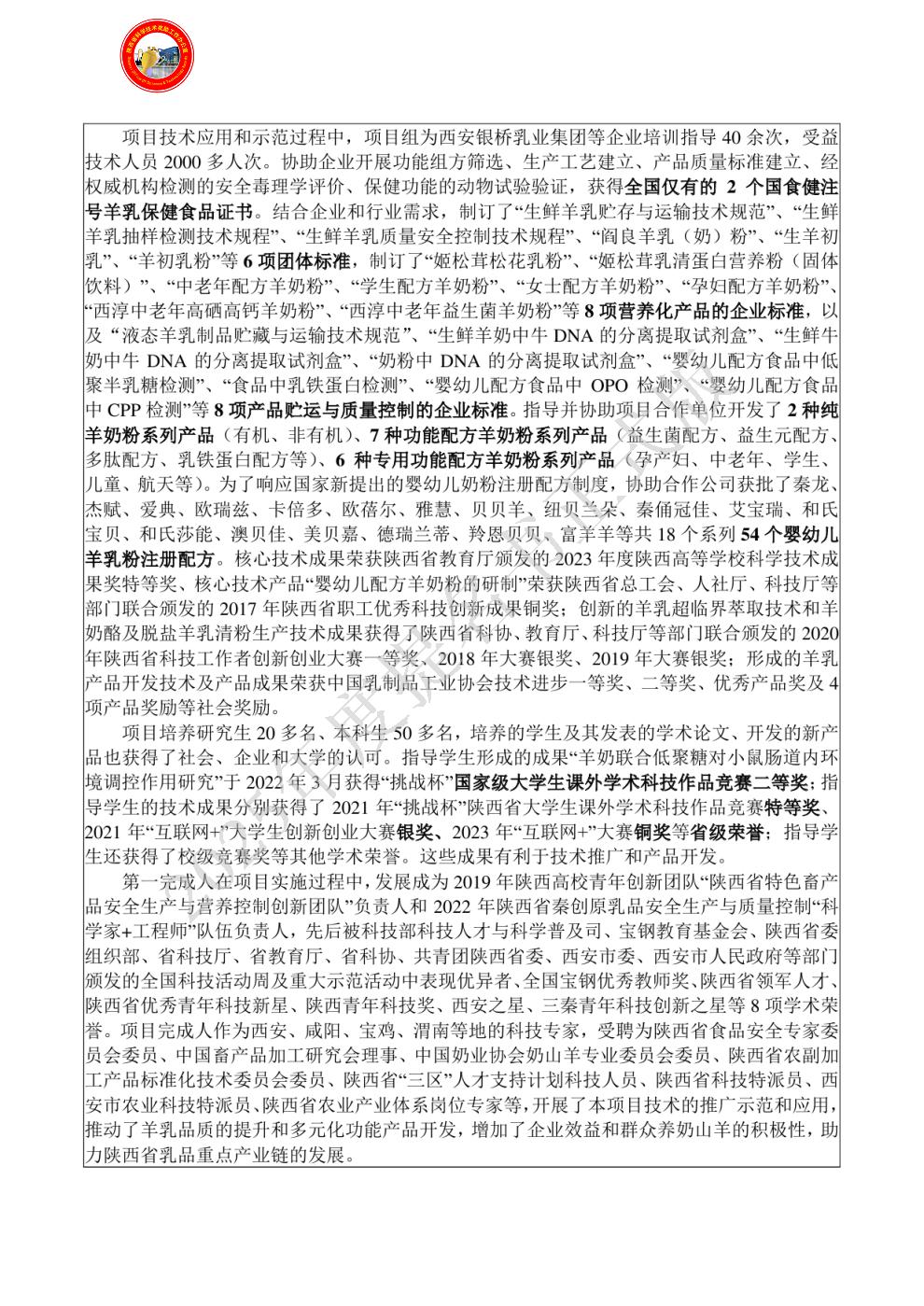 排名:7 行政职务:主任 技术职称:副主任医师 工作单位:陕西功能食品工程中心有限公司 对本项目技术创造性贡献:主要开展了秦岭中草药功能因子分析,组方配伍,开发了首个羊乳保健食品、多个特殊医学羊乳食品、特殊膳食羊乳食品、功能配方羊乳粉等羊乳产品,建立了基于营养安全控制+活性物质功效评估的羊乳功能产品高效开发新方法;进行了相关技术的示范推广。获得知识产权2项(制订标准2项),对创新点中的第3项做出了创造性贡献。(支撑材料:必备附件2-1~8,3-1;其他附件1-22~29,2-14知识产权54、55,2-20,2-25,2-28~30) 曾获国家科技奖励情况:1)参与的“羊乳安全生产与质量控制及产业化示范”项目成果,2023年获陕西高等学校科学技术研究优秀成果奖,特等奖,7/11;2)主持的“特色营养健康食品研究开发与产业化”技术成果,2023年获陕西省科学技术奖,一等奖,第一完成人,2020-J-204110-1-R01。