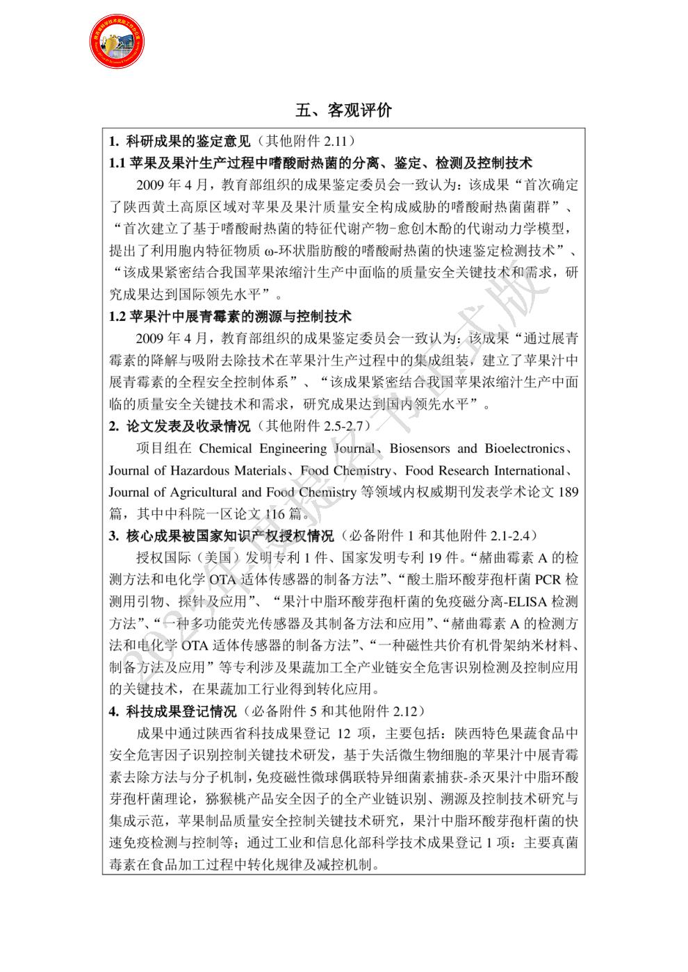 排名:15 行政职务:无 技术职称:无 工作单位:西北大学 对本项目技术创造性贡献:参与了苹果、猕猴桃等特色果蔬食品中主要危害因子展青霉的吸附,开发“生物吸附-化学去除”协同技术体系,并研发了关键技术装备。对创新点2做出了重要贡献,证明性材料见其他附件2.5。 曾获国家科技奖励情况:陕西高等学校科学技术研究优秀成果特等奖1项。