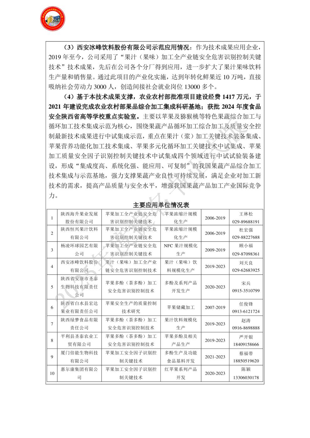 单位贡献:作为第二完成单位,在项目实施过程中发挥了重要的组织、协调和落实作用。主持完成了国家自然科学基金、国家“十三五”重点研发计划子课题、陕西省重点研发计划项目、农业农村部农产品质量安全风险评估项目等,从时间、人力、物力、财力等方面为项目实施提供了有力保障,保证了项目的顺利实施,促进了项目成果在全国范围的示范推广。