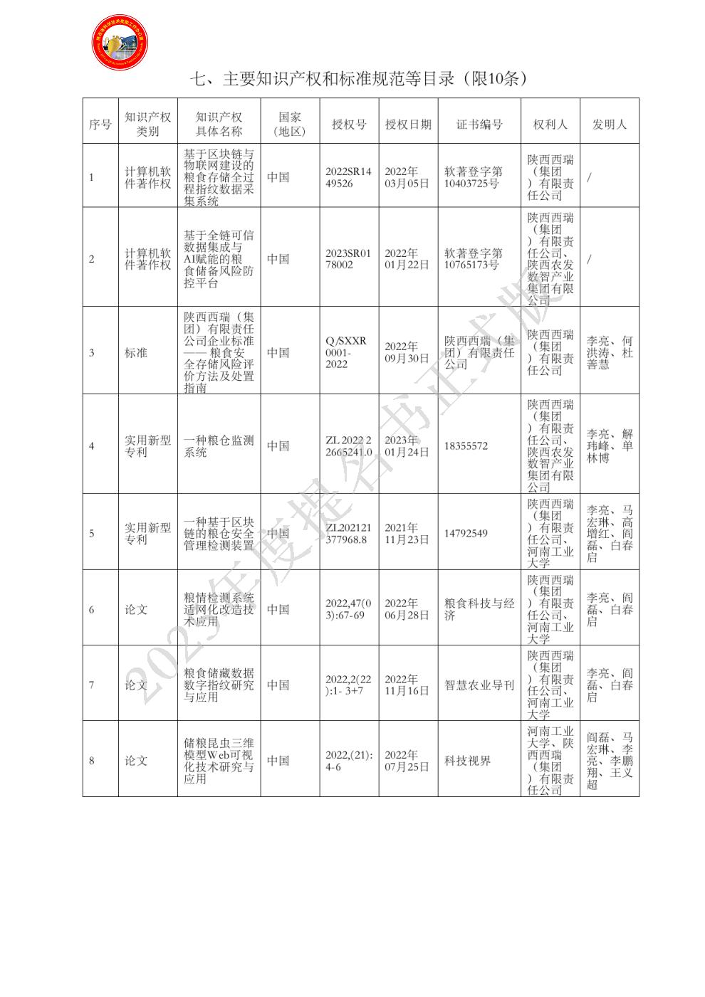 排名:1 行政职务:研发中心主任 技术职称:高级工程师 工作单位:陕西西瑞(集团)有限责任公司 对本项目技术创造性贡献:作为项目负责人,全面负责项目总体规划与实施,牵头完成区块链底层架构搭建,联合技术团队部署联盟链节点,实现粮食储备数据(库存、质量、出入库)的实时上链存证,保障数据不可篡改。推动建立跨部门数据协同机制,对接粮库、质检、应急等多系统,打通数据壁垒,形成“储备-监测-预警”一体化数据流转链路(佐证材料:附件1.3、6.1-6.6)。 曾获国家科技奖励情况:2025年度,2025年陕西省企业“三新三小”创新竞赛三等奖,微波制备慢消化杂粮粉创新装备与应用项目,排名3。 - 姓名:解玮峰