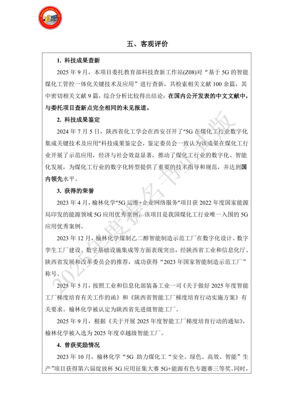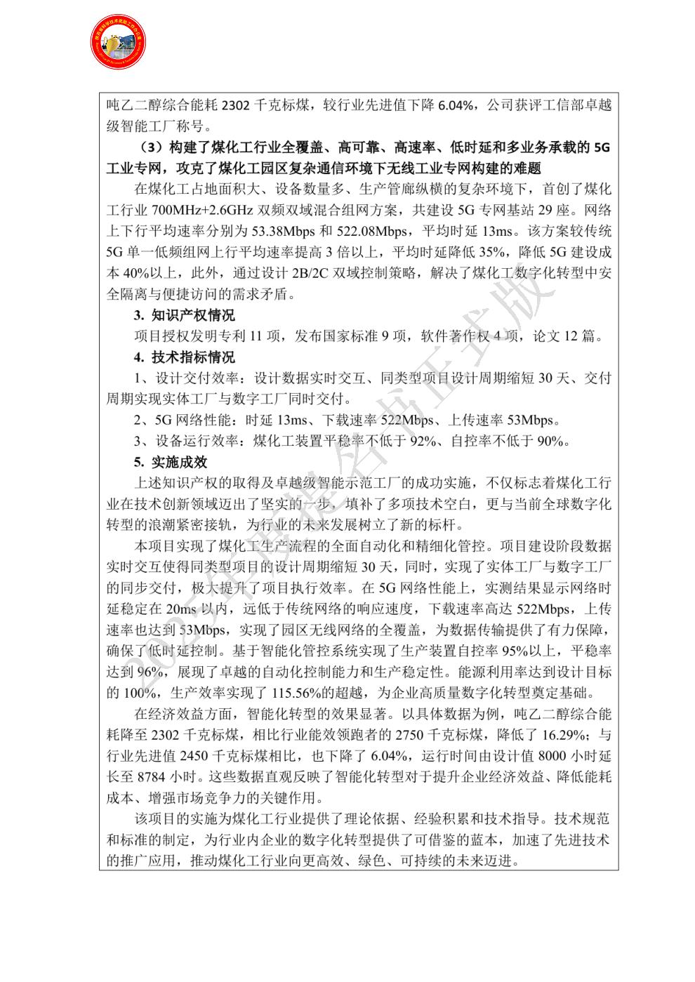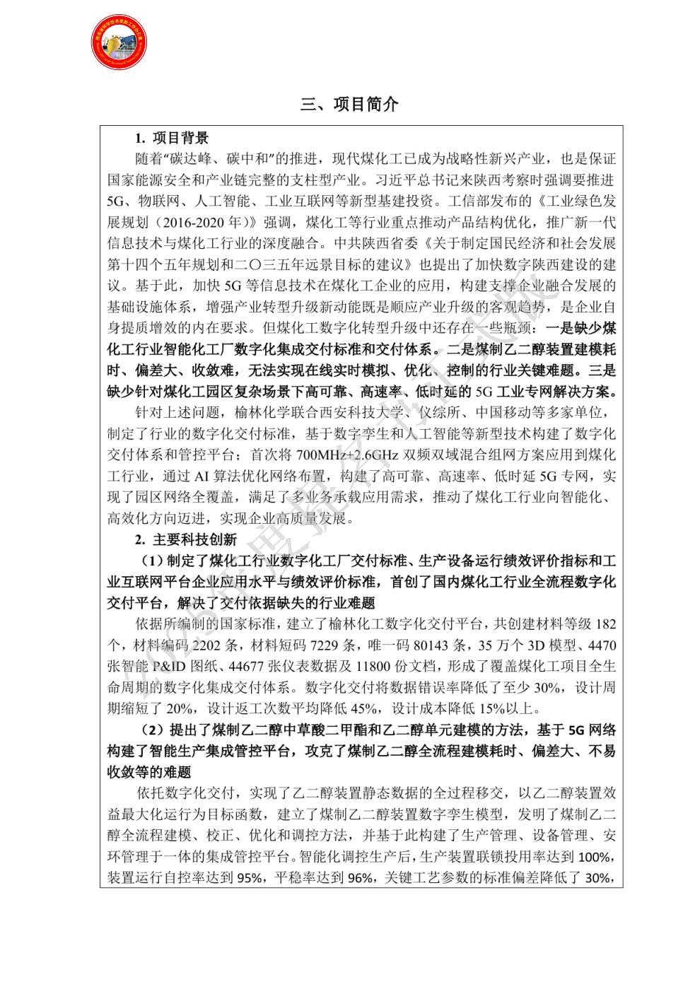 单位贡献:(1)陕煤集团榆林化学有限责任公司作为该项目牵头完成单位,负责主持项目整体技术方案制定、数字交付平台研发、5G网络部署和应用示范等,完成了项目预期研究目标,贡献如下: