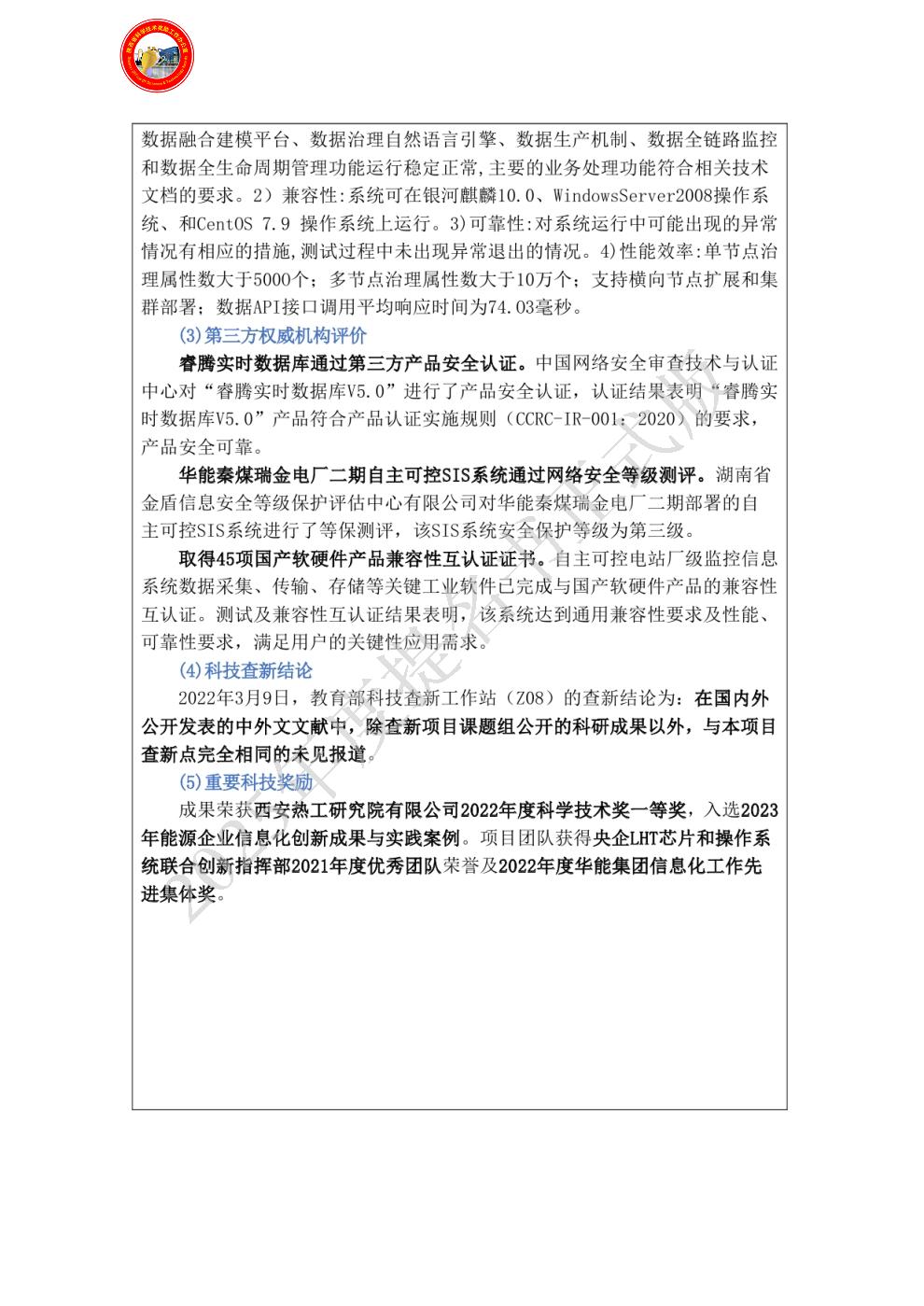 单位贡献:华能秦煤瑞金发电有限责任公司是该项目科技创新点1-3的主要完成单位,同时也是该项目核心技术的具体实施应用单位,负责该项目创新点中的全国产厂级监控信息系统应用软件的架构设计和功能需求方案的确定和现场调试验证,指导完成工程示范应用。