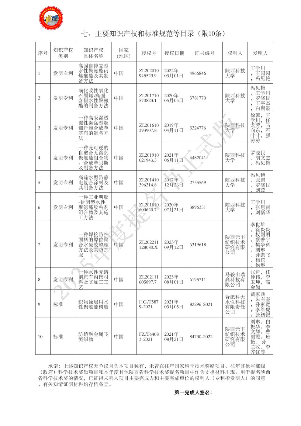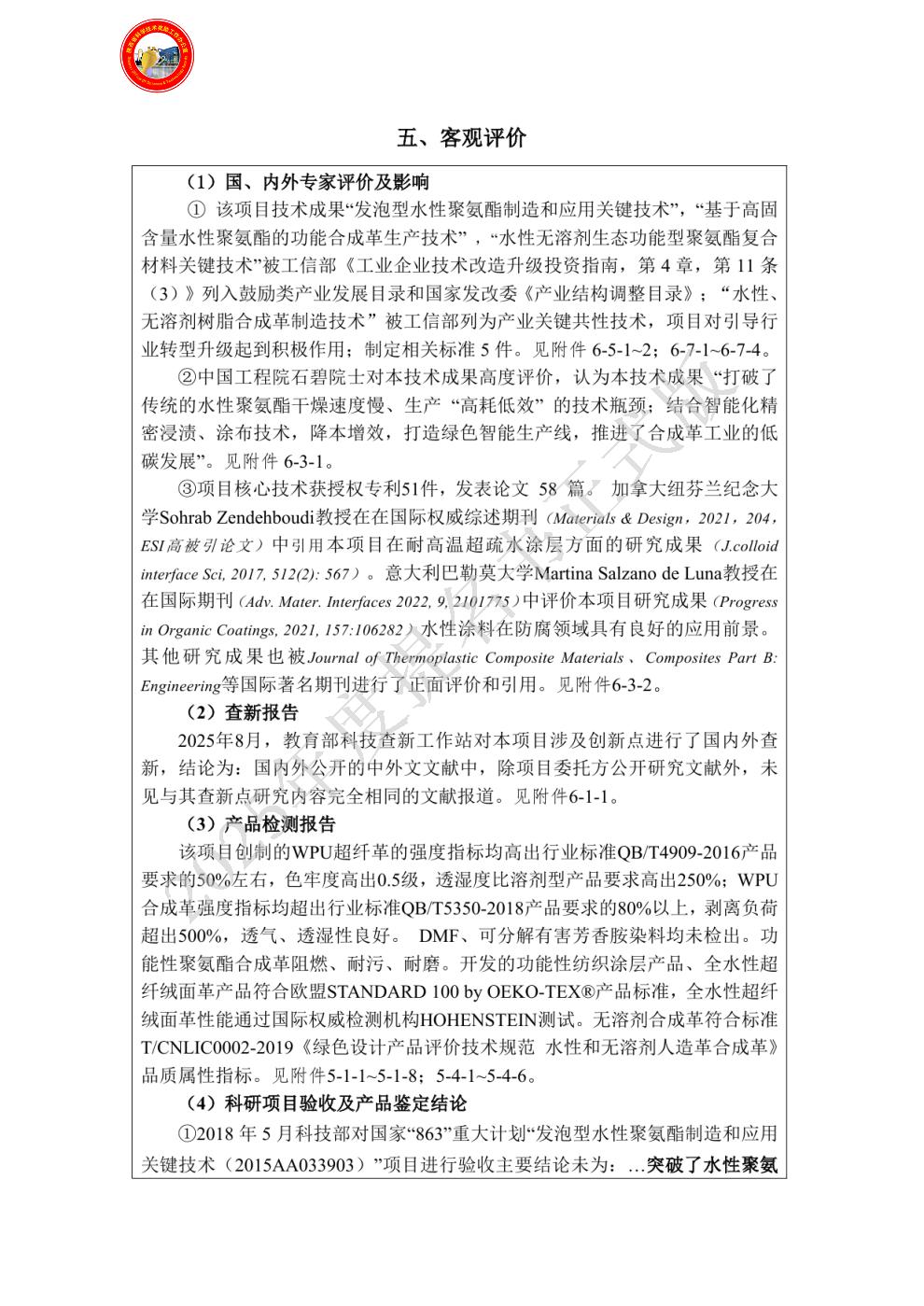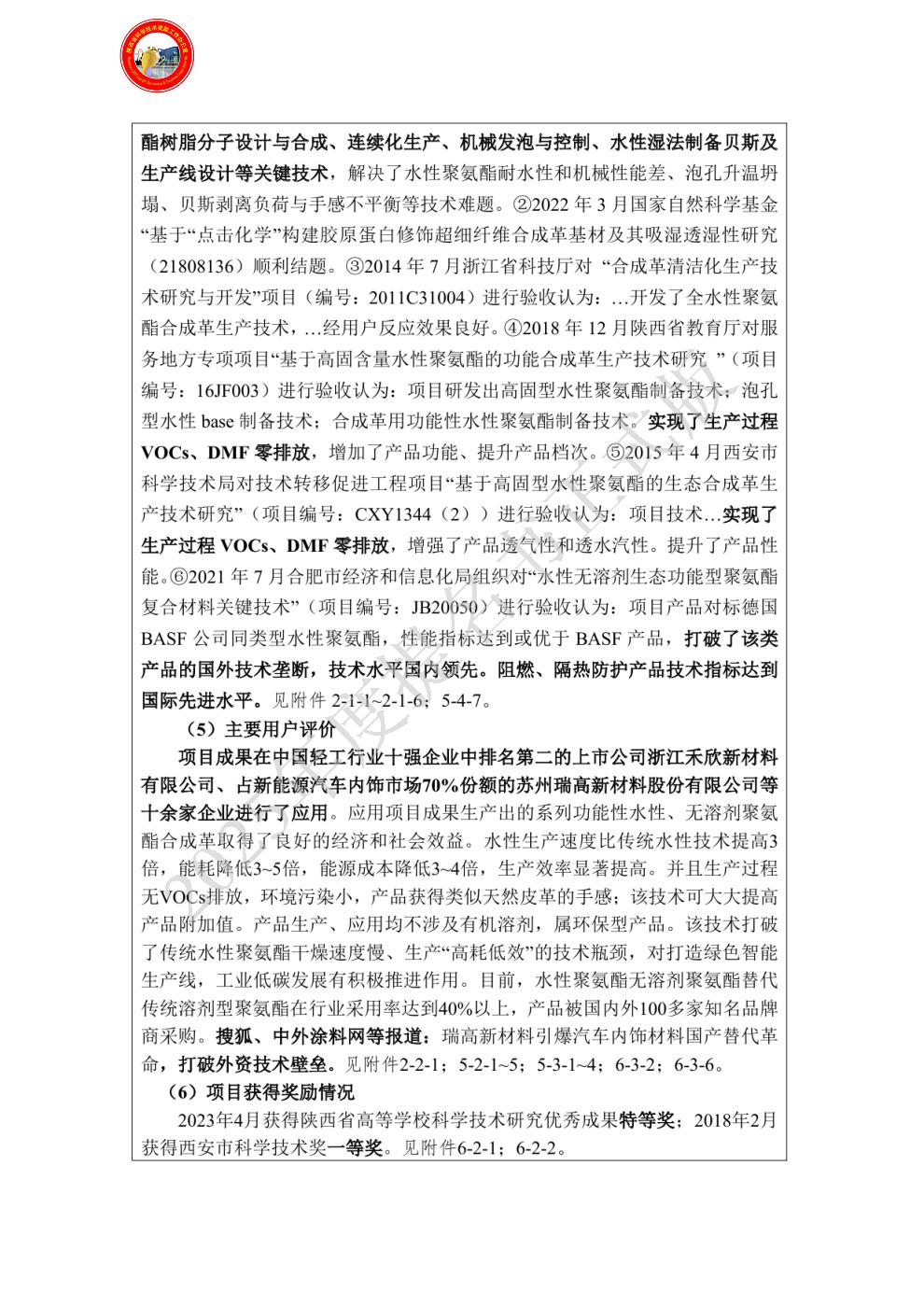 (创新贡献见附件:1-1-3;2-1-2;6-2-1) 曾获国家科技奖励情况:2017年度,陕西高等学校科学技术奖一等奖,胶原蛋白改性超细纤维合成革关键技术的创制及推广应用,排名:7/9。2023年,陕西省高等学校科学技术研究优秀成果特等奖,环境友好功能性聚氨酯/纤维基复合材料创制关键技术,排名:7/11.