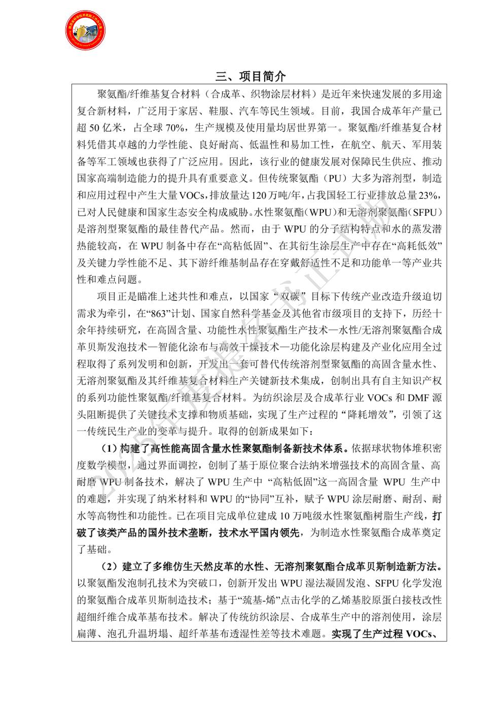 2.负责仿生真皮、功能性聚氨酯合成革生产技术的中试和产业化应用,对创新点(2)和创新点(4)的产业化推广做出了重要贡献。