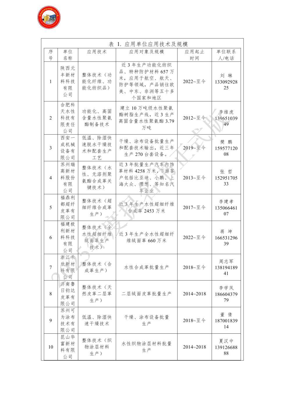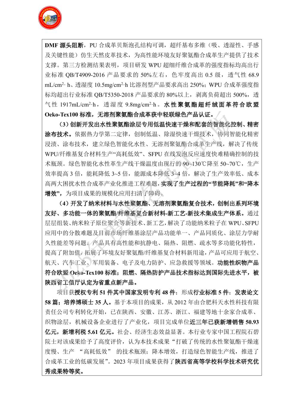 单位贡献:西安一成机械设备有限公司,项目主要完成单位。在项目实施过程中开发的水性涂层快速干燥技术和陕西科技大学开发的水性聚氨酯凝固技术配套,解决了水性涂层干燥时间长、生产效率低的技术瓶颈,促进了水性聚氨酯的市场化应用进程。