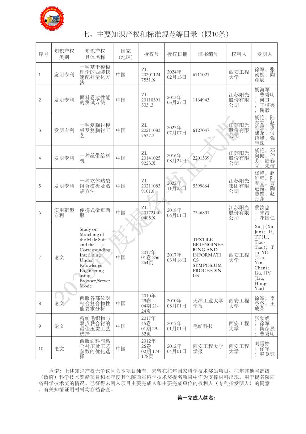对应主要发现、发明及科技创新的第5、6项技术创新点。参与了项目研究,发明了西服面料与粘合衬配伍粘合的工艺优化装置,改进了高档西服面辅料匹配轻薄化问题,实施了高档职业装造型功能快速智能检测系统的企业应用实践。产业化过程中,形成授权专利 2 件。(附件21;附件24;附件17) 曾获国家科技奖励情况: