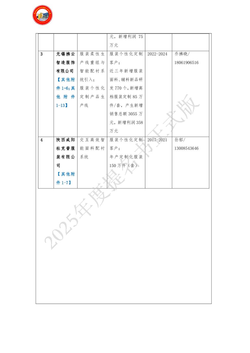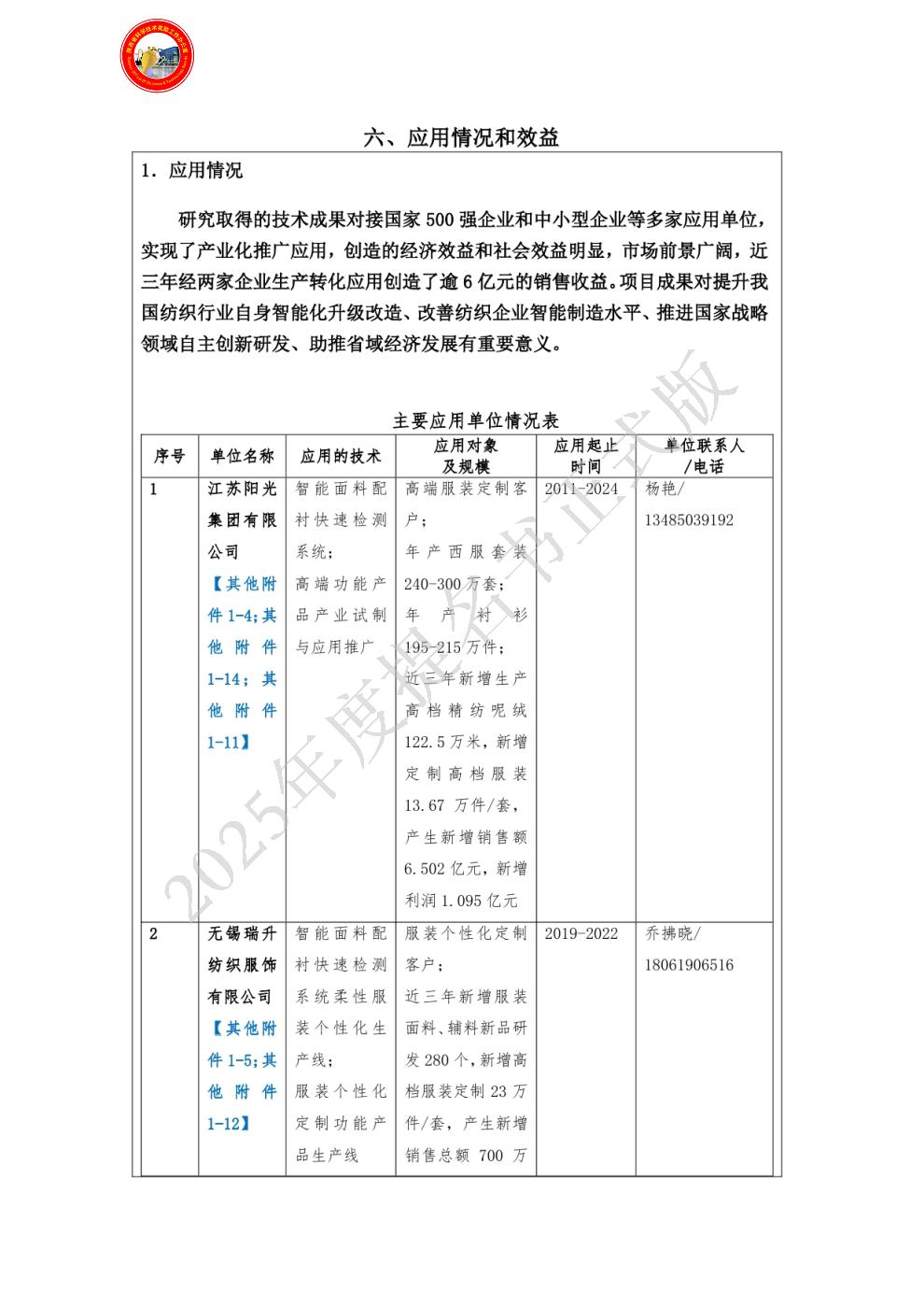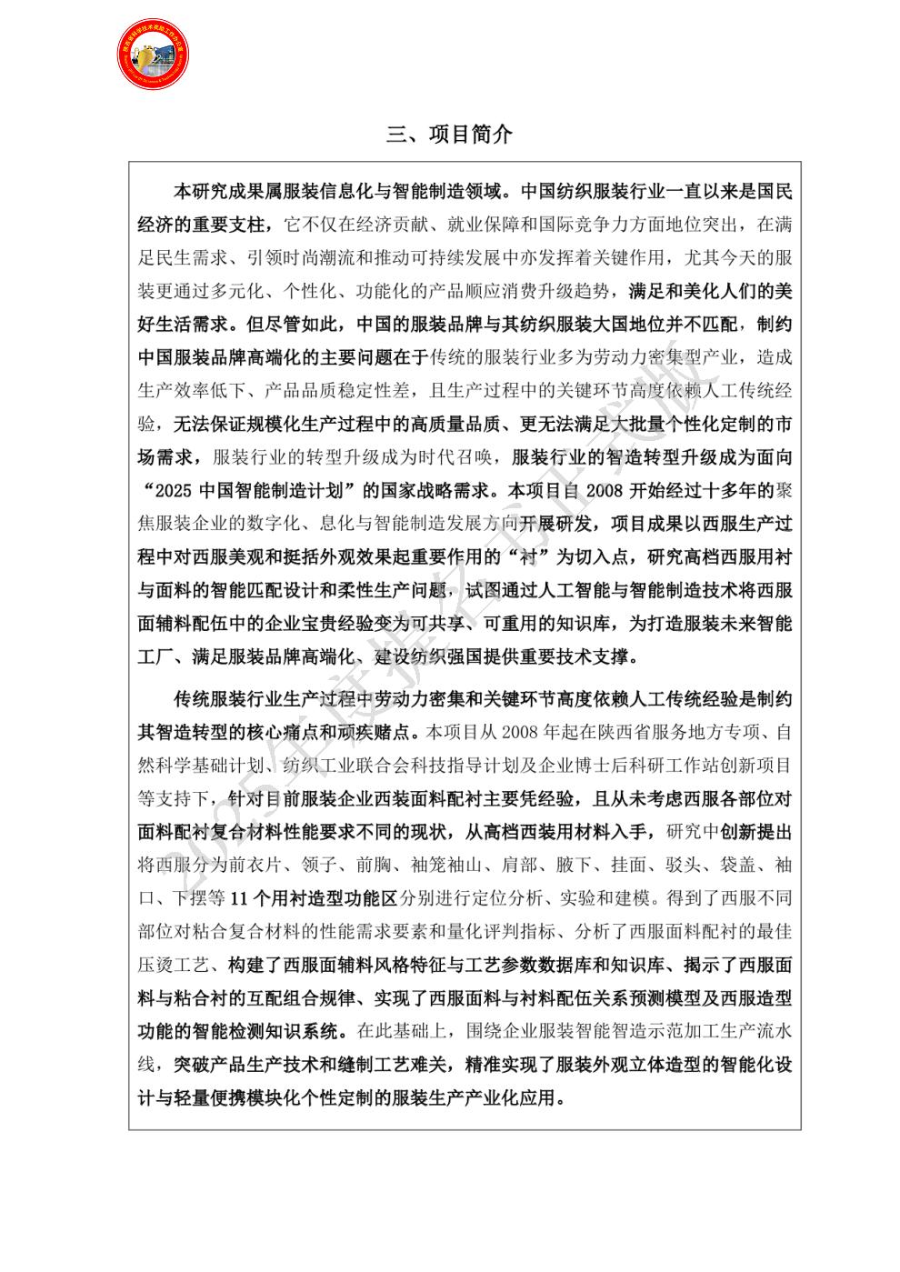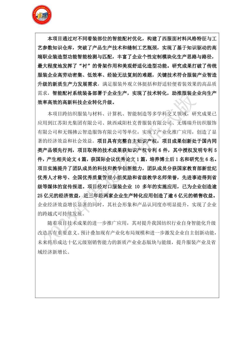 对应主要发现、发明及科技创新的第4、5项技术创新点。参与了项目研究,实施高档职业装造型功能快速智能检测系统的企业应用实践,主持完成企业2个车间的智能化升级改造,主导服装模板技术研发,优化和改进了西服胸衬、贴袋匹配加工部件与缝制工艺,使得生产效率提高25%-30%。产业化过程中形成授权专利3件。(附件3;附件21;附件22;附件23;附件17) 曾获国家科技奖励情况: 2024年,中国服装行业科技进步推荐项目,服装混流智能生产线的动态平衡管理系统,排名1;