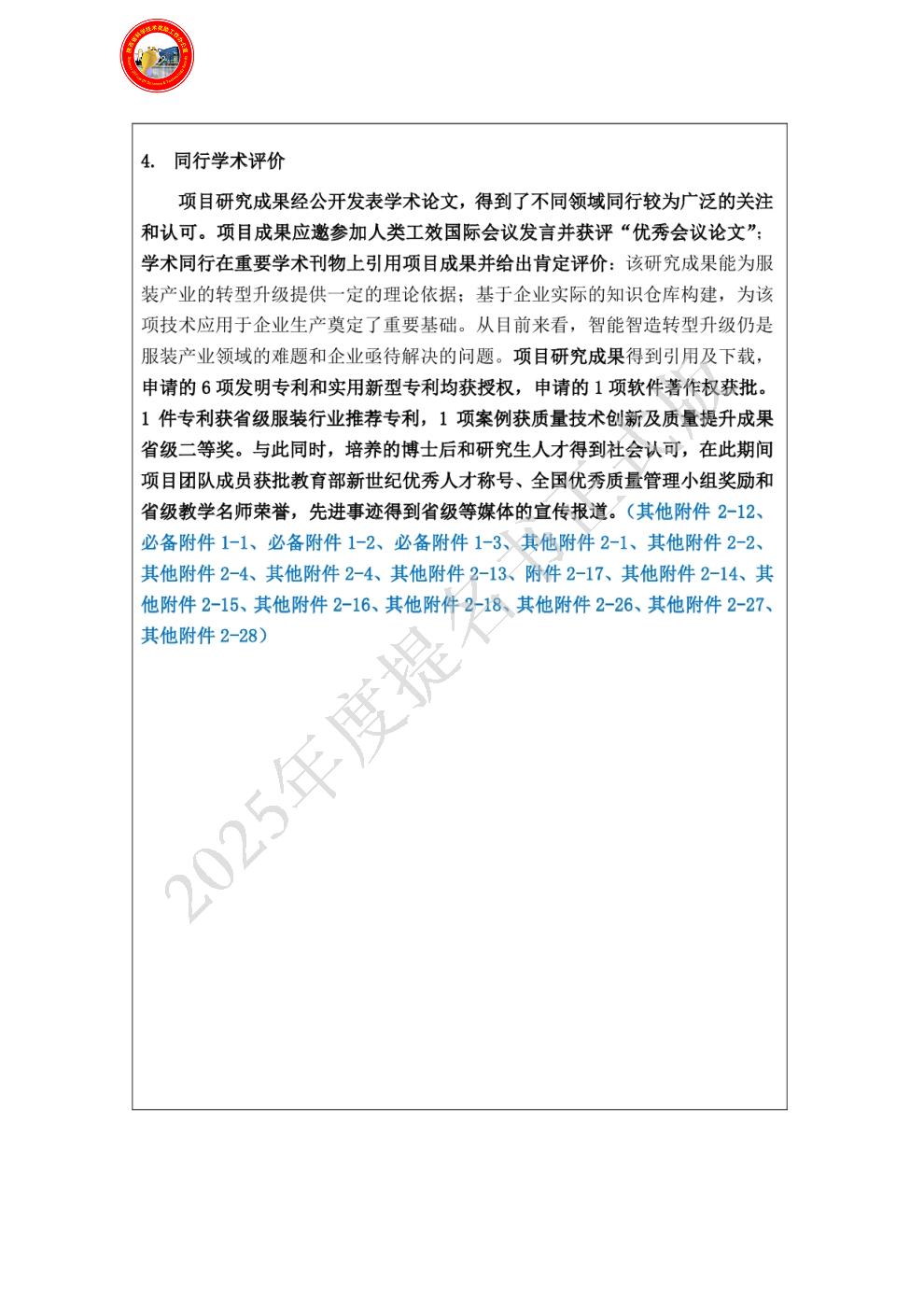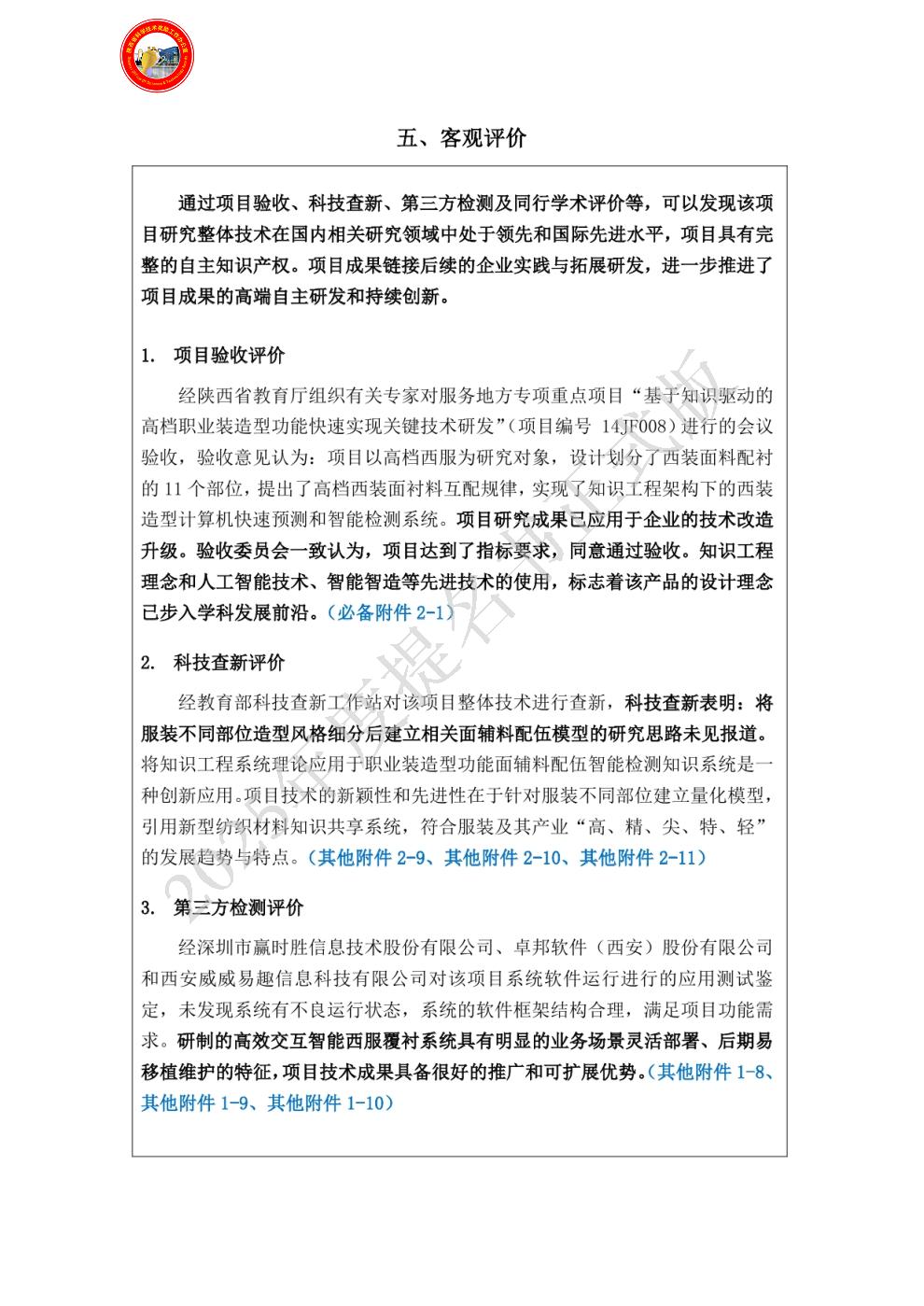 对应主要发现、发明及科技创新的第4项技术创新点。参与了项目研究,构建研发了西服造型功能智能检测知识系统。与第一完成人共同发表论文 1 篇。(附件25;附件4) 曾获国家科技奖励情况: