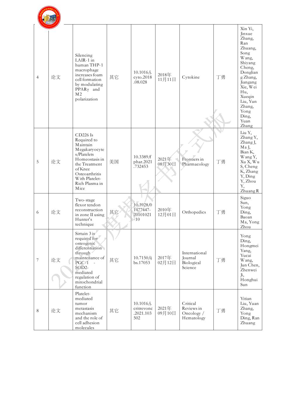 排名:1 行政职务:科主任 技术职称:主任医师 工作单位:西安市红会医院(西安市骨科研究所) 对本项目技术创造性贡献:为本项目第一完成人,负责项目的总体规划及实施,所有创新点中均参与研究。主要学术贡献包括 :发现LAIR-1分子在关节炎患者滑膜组织中表达,首次揭示了LAIR-1在破骨细胞分化中的作用,提示LAIR-1可能在关节炎治疗中具有潜在的临床意义,筛查出新的OA性别差异相关基因,并证实其作用及其在OA发病机制中的潜在影响。较早探索不同阶段膝骨关节炎治疗方式,确立了膝骨关节炎综合阶梯化治疗的新模式,并大力推广膝骨关节炎综合阶梯化治疗。主要成果:附件1-1-1、1-1-2、1-1-3、2-2-15、2-2-17到2-2-25 曾获国家科技奖励情况: - 姓名:吕科