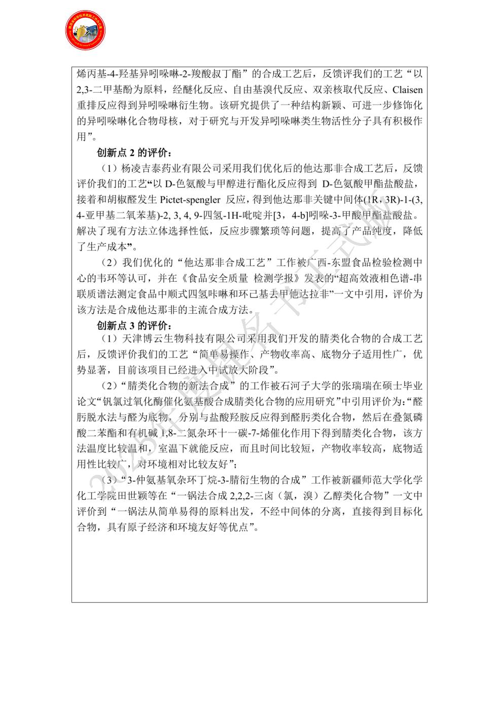 该项目2025年获陕西高等学校科学技术研究优秀成果二等奖。并相继获得国家授权专利8项,其中发明专利4项,实用新型专利4项;发表科学研究论文84篇,其中SCI收录36篇;同时培育了一支优秀的药物合成科研团队。上述创新成果经过多年的推广应用,取得了良好的社会效益和经济效益。我单位认真审阅了该项目推荐书及附件材料,确认全部材料真实有效,无知识产权纠纷、人员排序无争议,并按照要求,责成项目完成人所在单位及合作完成人所在单位已对该项目的基本情况进行了公示,未收到任何异议。现推荐该项目申报2025年度陕西省科技厅科学技术进步奖三等奖。