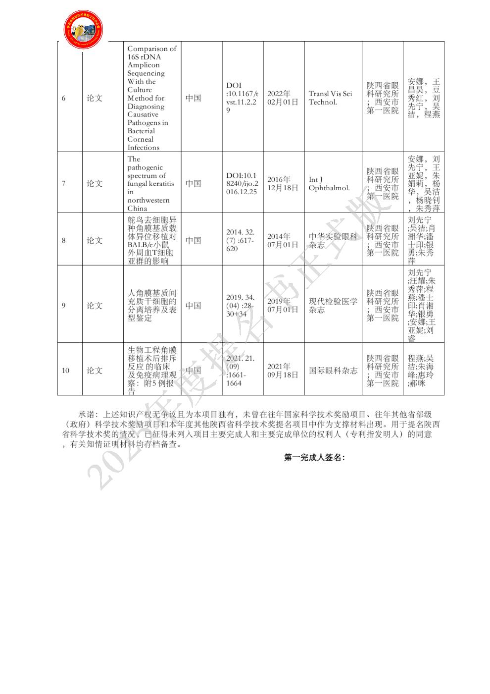 排名:1 行政职务:无 技术职称:研究员 工作单位:陕西省眼科研究所 对本项目技术创造性贡献:负责项目的总体设计及主要实施,对本项目《主要技术创新》中所列出的第(1.1-1.4) 项科学发现作出了创造性贡献,是第1-9 篇代表性论文(专利)的作者。 曾获国家科技奖励情况:2008年西安市科学技术三等奖《兔碱烧伤角膜移植术后排斥反应的早期诊断》第六(2008-3-32-R6);