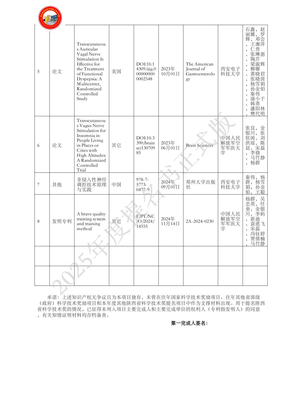 排名:3 行政职务:科室副主任 技术职称:副教授 工作单位:中国人民解放军空军军医大学 对本项目技术创造性贡献:参与本项目部分工作,负责干预方案制订、文章修改等,参与完成科技创新一所列“1.2明确背外侧前额叶皮层是精神心理疾病神经调控的共同干预脑区”、科技创新二所列“2.1 创建爆发式短程短时中枢神经干预新策略”等研究,以及陕西省建议案的编撰、创新技术及设备的推广应用等。相关证明材料见附件。 曾获国家科技奖励情况:[1] 2024年6月,陕西高等学校科学技术研究优秀成果一等奖,精神心理问题心理及物理干预技术研究,排名第四;[2] 2022年12月,陕西省科技工作者创新创业大赛二等奖,基于趋避训练范式的成瘾行为戒除系统,排名第七。 - 姓名:杨雪娟