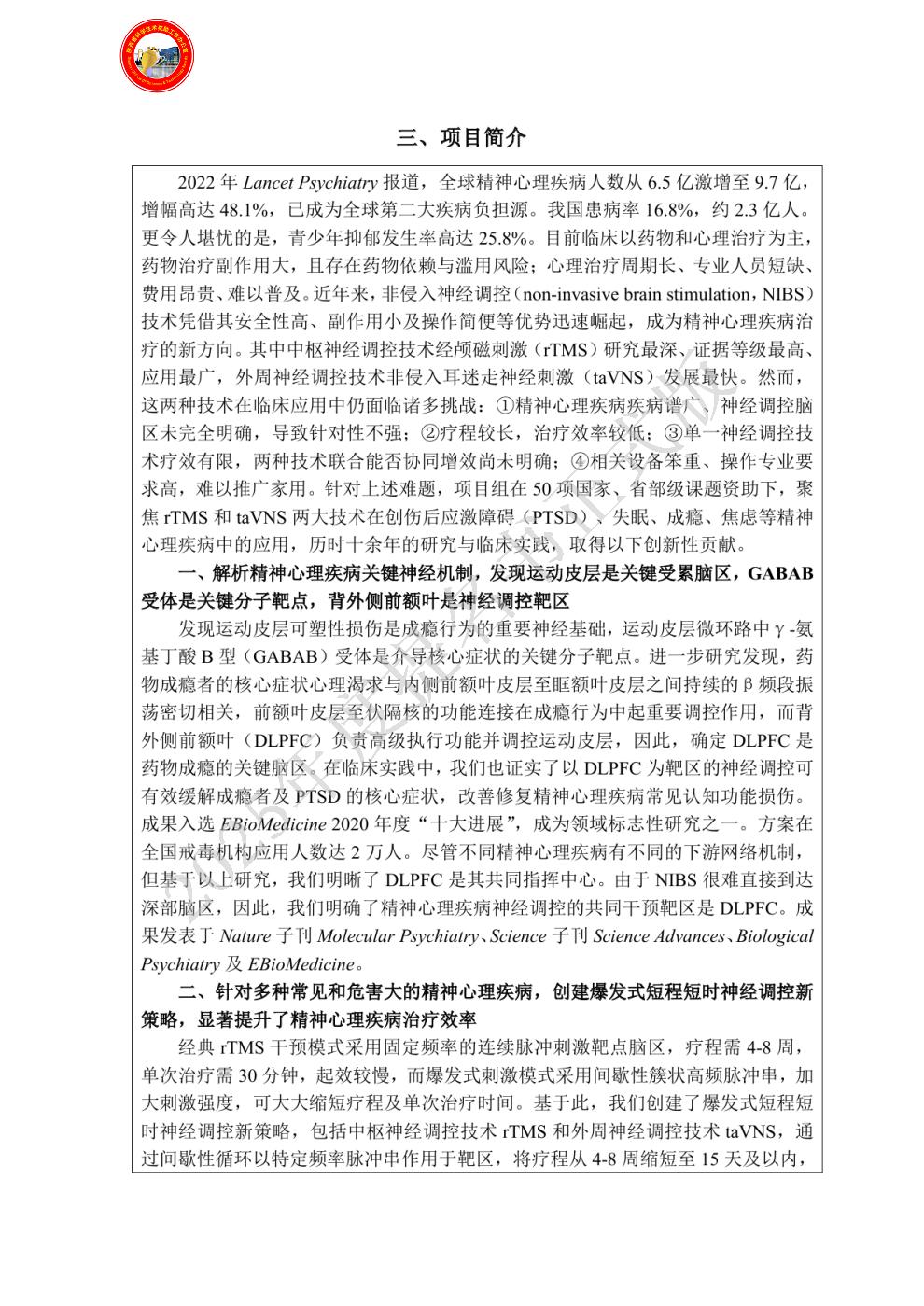 排名:1 行政职务:科室主任 技术职称:教授 工作单位:中国人民解放军空军军医大学 对本项目技术创造性贡献:主持本项目的大部分工作,负责研究思路总体设计、创新方案的制定与组织实施等工作。主要完成:科技创新一所列“1.2 背外侧前额叶干预靶区在PTSD及睡眠障碍中的验证性研究”、科技创新二所列“2.1 创建精神心理疾病爆发式短程短时中枢及外周神经靶向干预方案,并联合项目组其他团队共同开展相关验证性研究工作”、科技创新三所列“3.1 创建‘tDCS+taVNS’中枢外周协同干预策略,并负责验证性研究”;与团队合作共同研发科技创新四中迷走神经刺激仪等多款神经调控新设备,并开展推广应用工作。同时,积极将研发的设备推广应用于部队及消防等特殊单位,为项目成果的推广应用做出了重要贡献。相关证明材料见附件。 曾获国家科技奖励情况:[1]2024年6月,陕西高等学校科学技术研究优秀成果一等奖,精神心理问题心理及物理干预技术研究,排名第一;[2] 2022年12月,陕西省科技工作者创新创业大赛二等奖,基于趋避训练范式的成瘾行为戒除系统,排名第一;[3] 2015年2月,陕西省科学技术奖二等奖,医学生职业适应性心理素质培养模式的构建与实践,排名第一。 - 姓名:袁逖飞