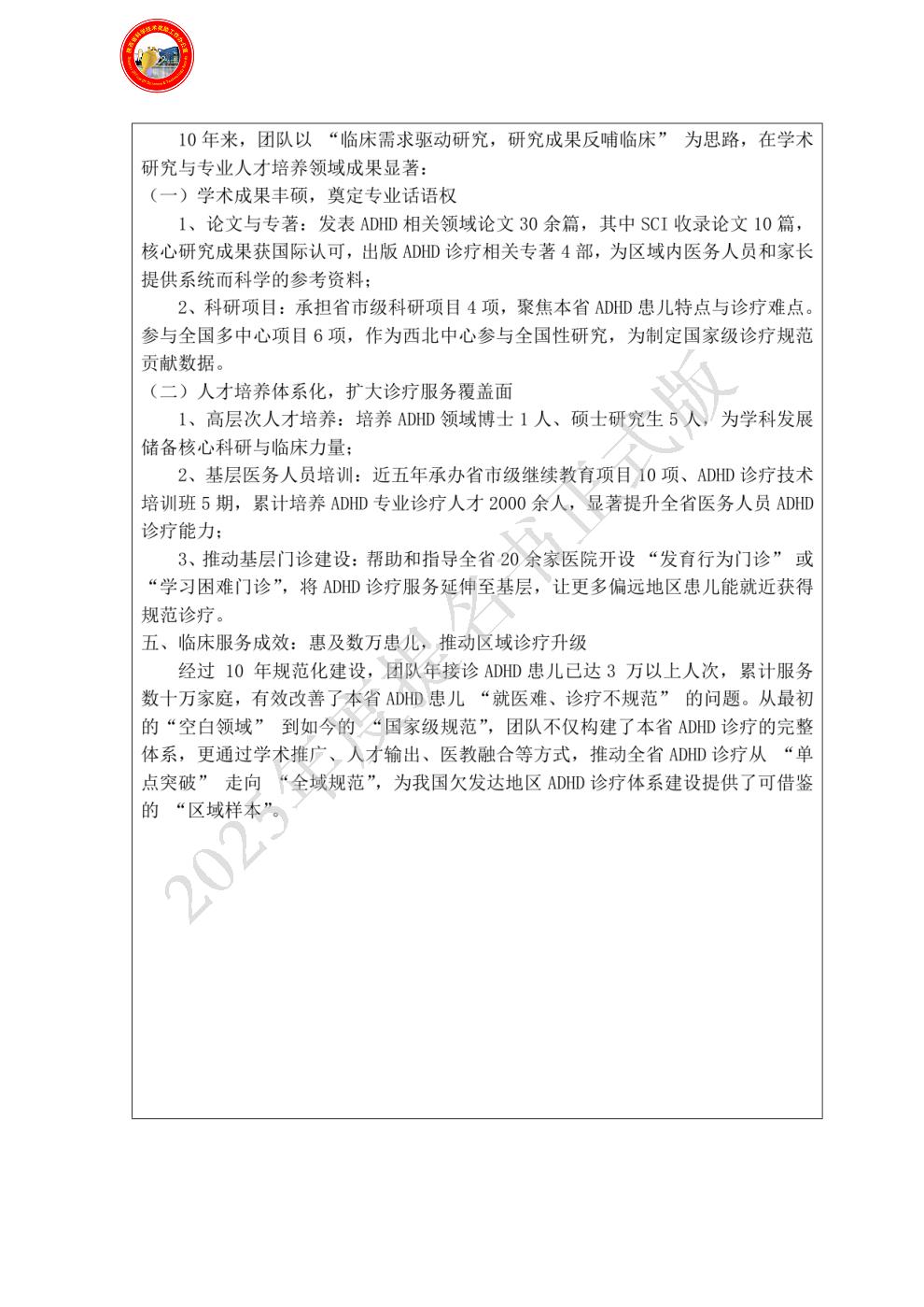 | 提名单位意见: | 《儿童注意缺陷多动障碍(ADHD)规范化诊疗体系的建立及推广》项目聚焦近年来儿童神经发育障碍诊疗领域的痛点问题,通过系统研究与实践,构建了一套科学、规范、可推广的标准化诊疗体系,具有重要的学术价值与应用意义。