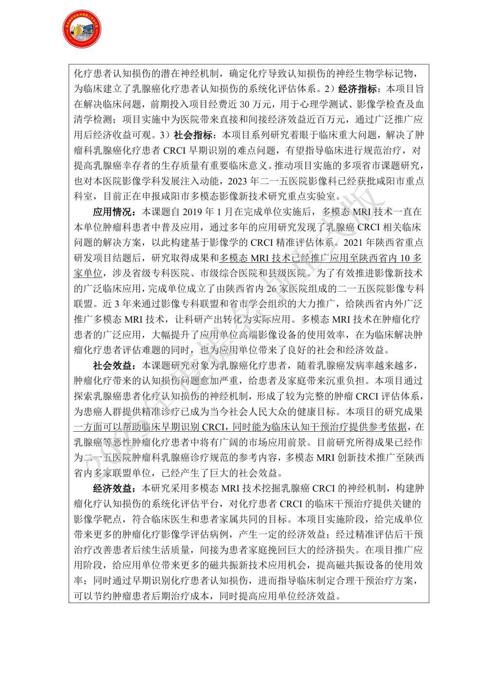 | 提名单位意见: | 本项目重点关注乳腺癌化疗相关认知损伤(CRCI)人群,应用多模态磁共振成像技术,创新性构建了CRCI的精准评估体系。其创新点主要体现在:一是科研设计严谨,统一化疗方案、开展纵向随访与横断研究,保证研究科学性;二是技术整合先进,融合T1结构像、DTI、rs-fMRI、ASL、MRS等多模态MRI技术,联合神经心理学测试与血清学检测,建立乳腺癌化疗认知损伤的纵向变化模型;三是机制研究深入,发现血红蛋白水平及DMN脑区异常为关键影像标记物,为认知干预提供理论支持。本项目通过对肿瘤化疗人群的系列科学研究,显著提升了CRCI的早期识别与干预治疗成效,所得成果经科技查新达到国内先进水平,已在陕西省10余家医院推广应用,带来良好的社会和经济效益。该项目成果对推广先进影像学技术、推动影像学与肿瘤学交叉发展、提升乳腺癌患者生存质量具有重要意义,为健康中国医疗事业发展贡献了团队力量。