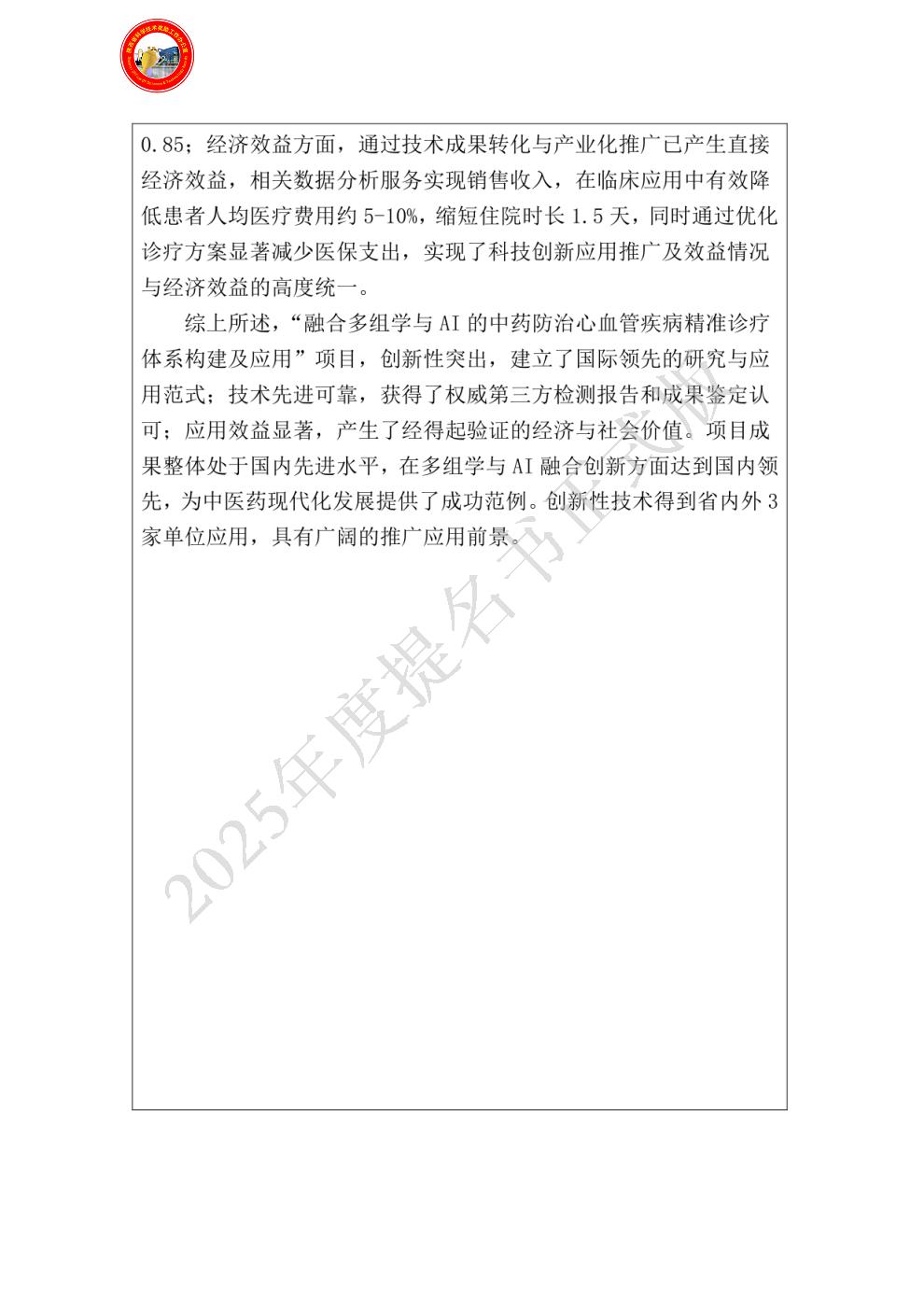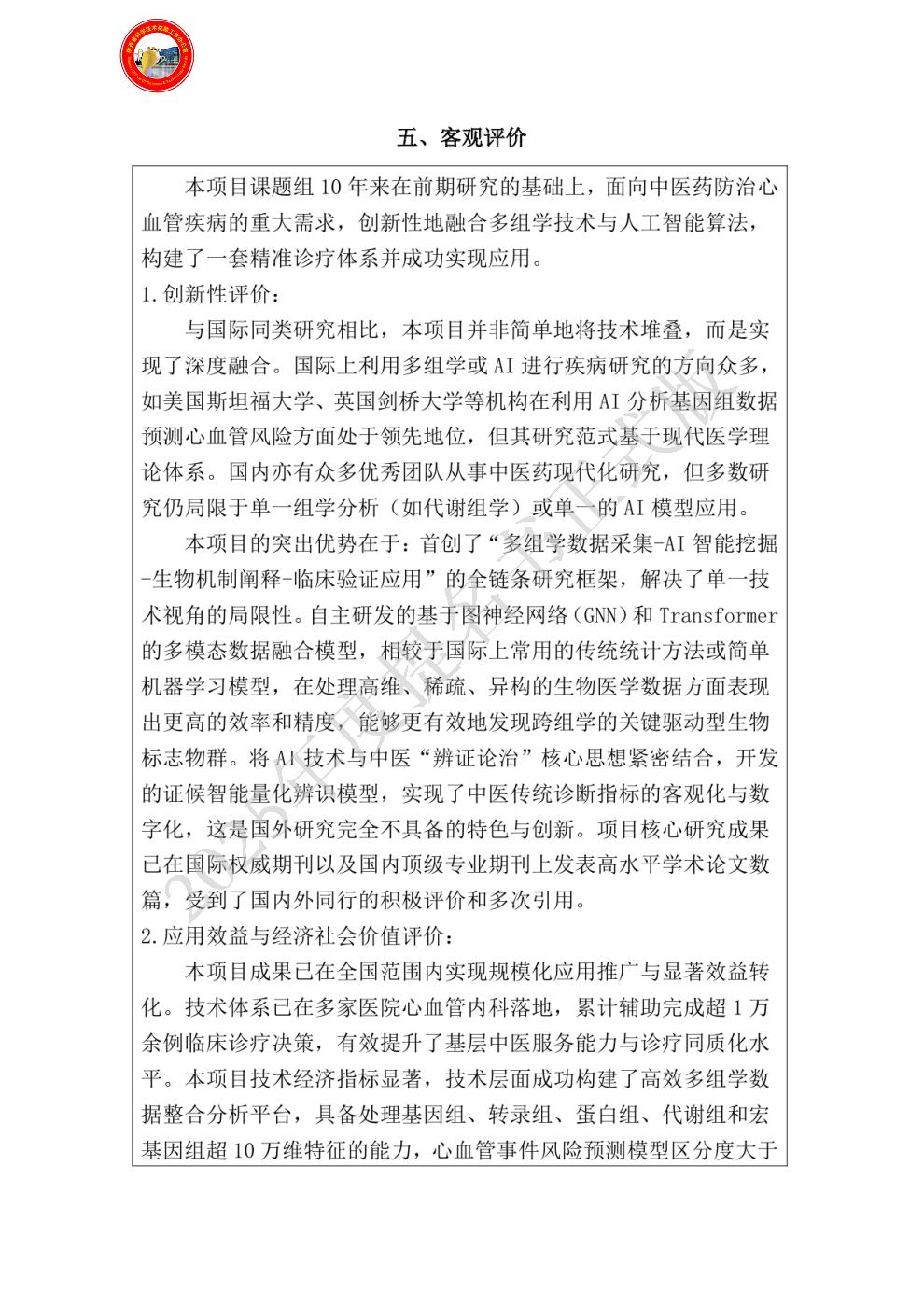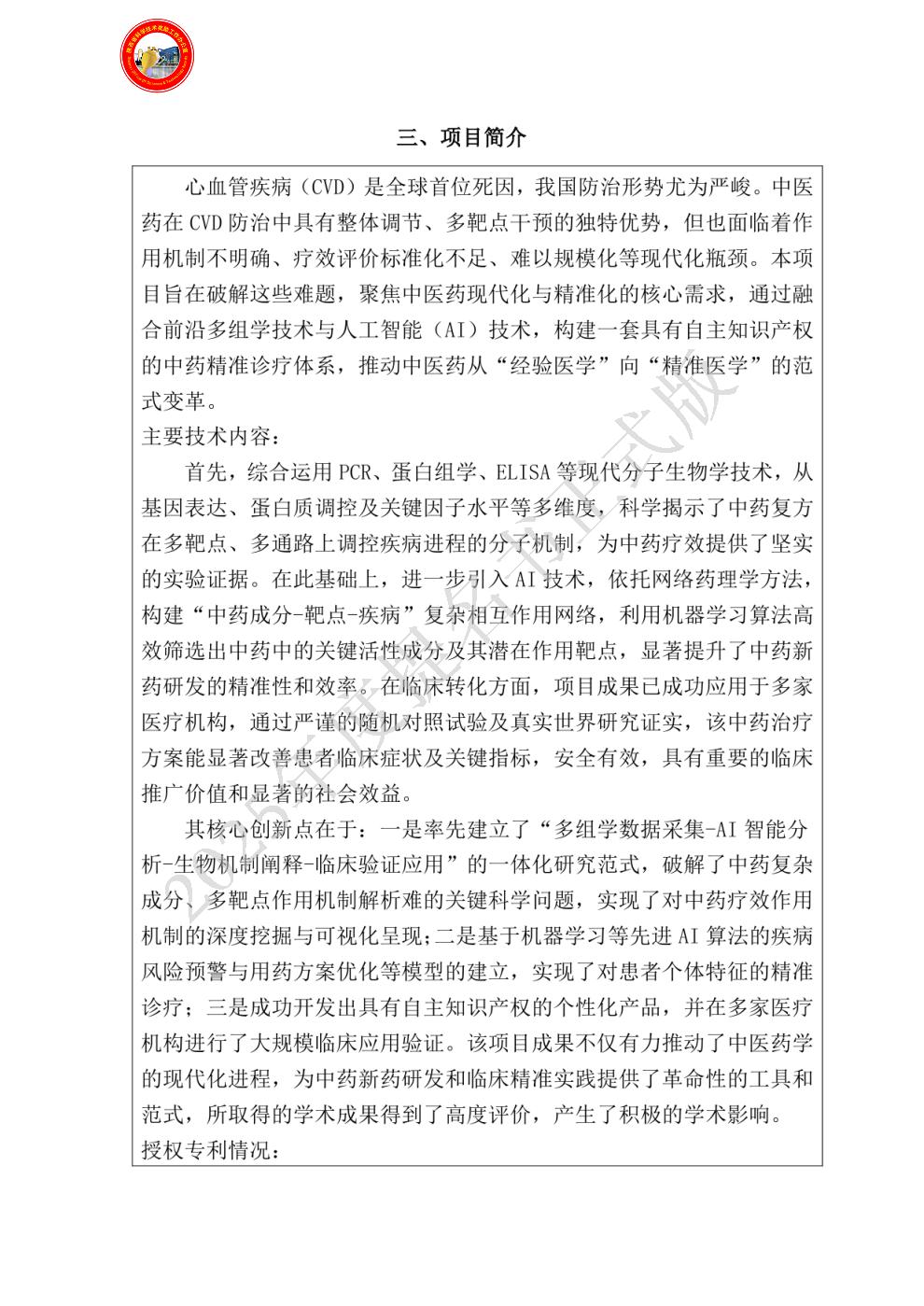 | 提名单位意见: | 我单位认真阅读了该项目提名书及附件材料,确认全部材料真实有效,相关内容符合陕西省科技进步奖的提名要求。该项目面向心血管疾病这一重大公共卫生挑战,聚焦中医药现代化与精准化的核心需求,创造性地将基因组学、蛋白组学、代谢组学等多组学技术与AI技术深度融合,成功构建了一套领先的、从理论创新、技术突破到规模化应用的全链条中药精准诊疗体系。其核心创新点在于:一是率先建立了“多组学数据采集-AI智能分析-生物机制阐释-临床验证应用”的一体化研究范式,破解了中药复杂成分、多靶点作用机制解析难的关键科学问题,实现了对中药疗效作用机制的深度挖掘与可视化呈现;二是基于机器学习等先进AI算法的疾病风险预警与用药方案优化等模型的建立,实现了对患者个体特征的精准诊疗;三是成功开发出具有自主知识产权的个性化产品,并在多家医疗机构进行了大规模临床应用验证。该项目成果不仅有力推动了中医药学的现代化进程,为中药新药研发和临床精准实践提供了革命性的工具和范式,所取得的学术成果得到了高度评价,产生了积极的学术影响。对照陕西省科技进步奖授奖条件,提名《融合多组学与AI的中药防治心血管疾病精准诊疗体系构建及应用》项目申报陕西省科技进步奖。