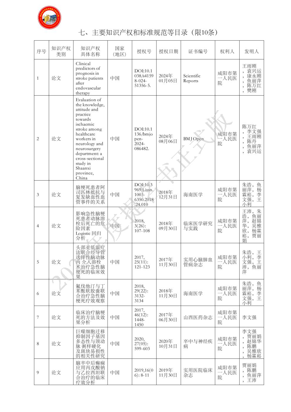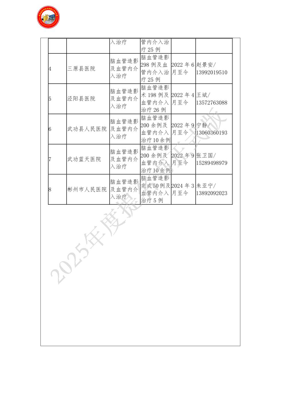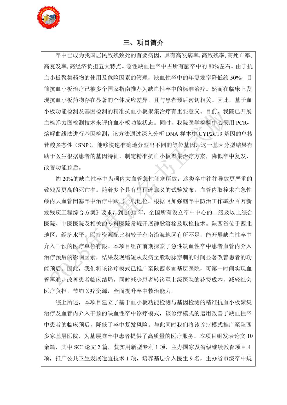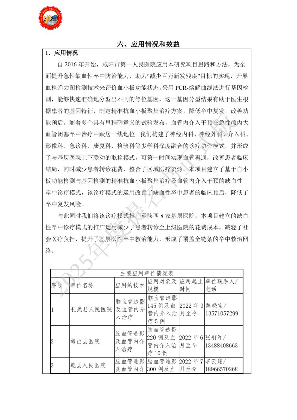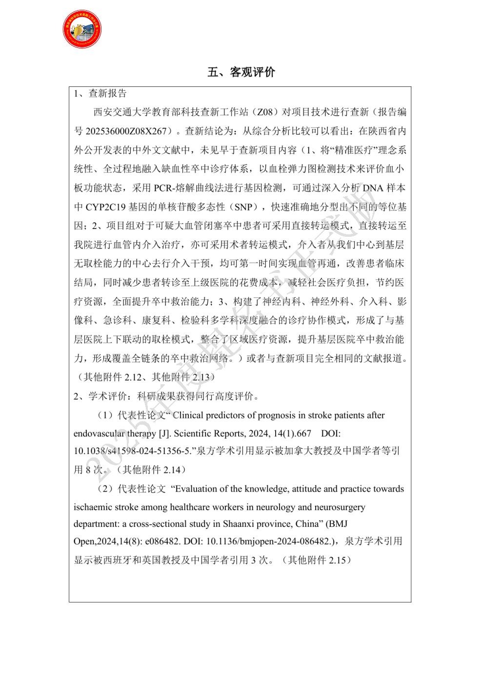 3、本院神经内科是陕西省重点专科, 2021年5月被国家卫生健康委授予高级卒中防治中心,近年来每年急诊血管内介入治疗300例以上,在2024年上半年全国高级卒中中心急性缺血性卒中介入再通技术综合排名中稳居第20-30位,陕西省稳居前3名。这些显著的医疗成果和优势,为本项目在陕西地区基层医院的广泛应用和推广奠定了坚实基础。
