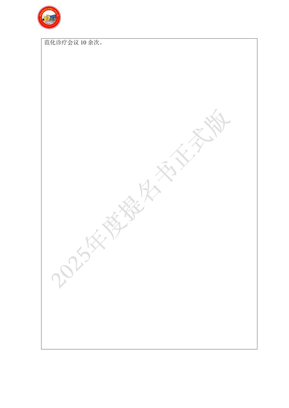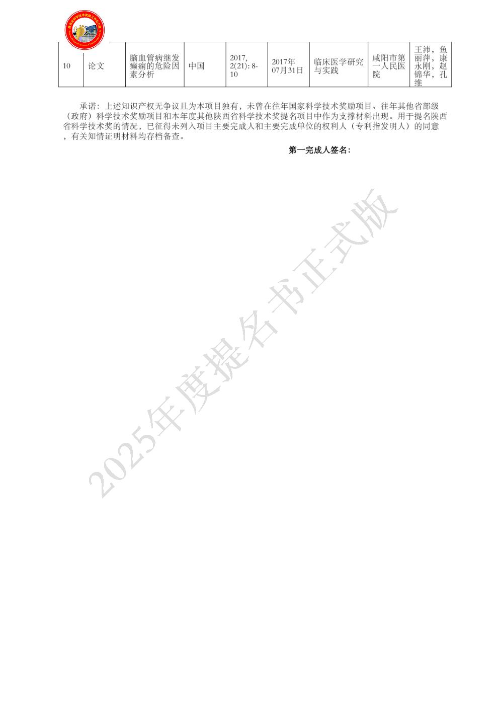 排名:7 行政职务:病区主任 技术职称:副主任医师 工作单位:咸阳市第一人民医院 对本项目技术创造性贡献:对本项目科技创新点三做出重要贡献,促进了与基层医院上下联动的取栓模式的应用与推广。(必备附件1.1;其他附件2.10) 曾获国家科技奖励情况: