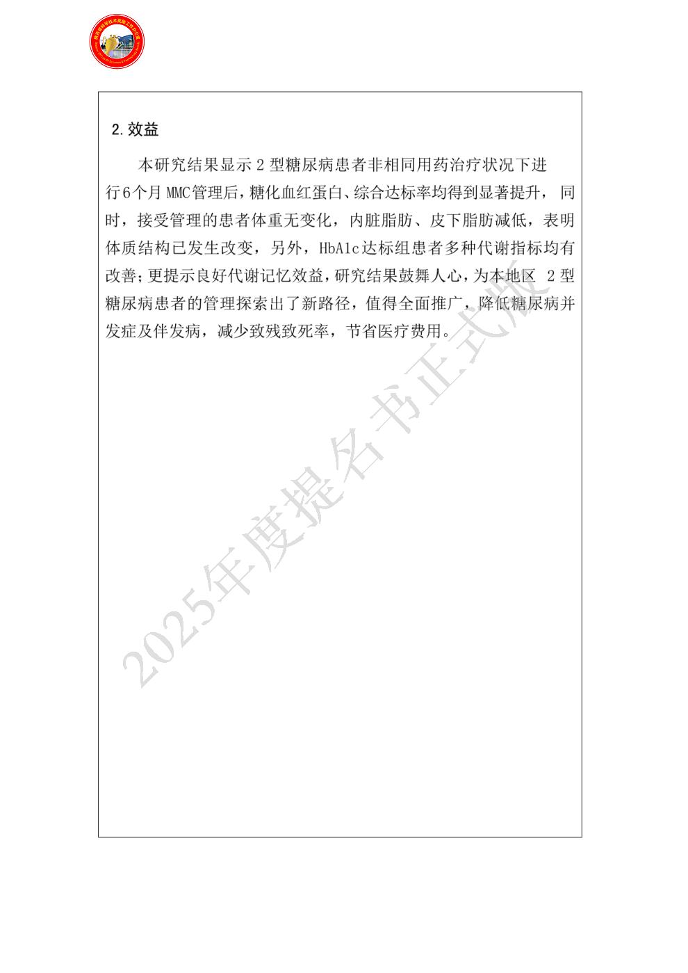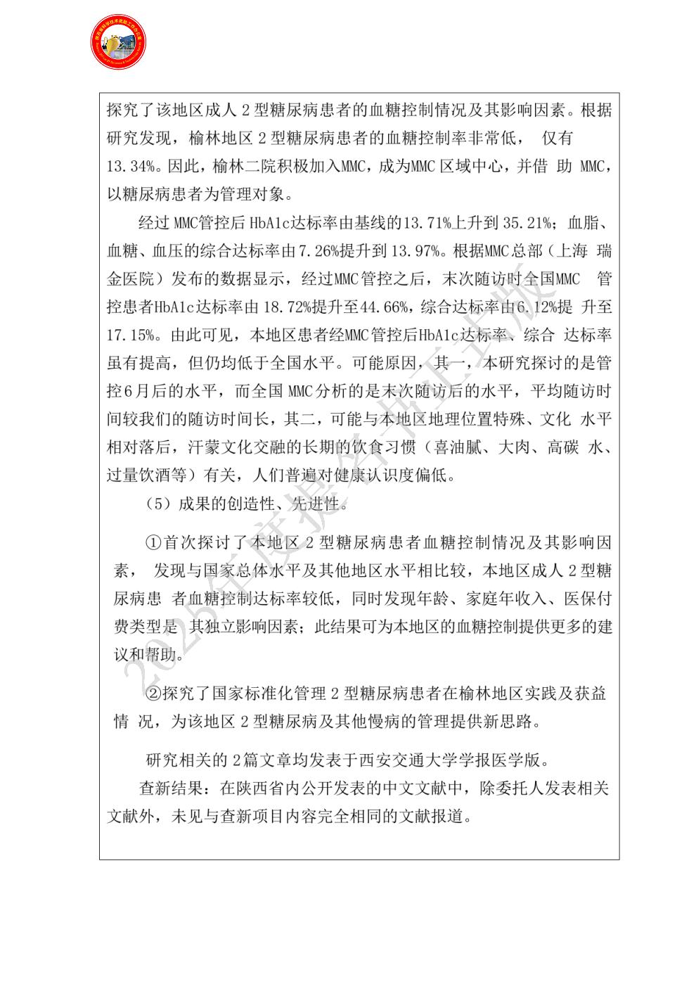 | 提名单位意见: | 糖尿病属于慢性疾病,长期患病除了显著增加家庭经济负担外,给国家和社会也带来沉重负担,因此全面管控糖尿病,降低糖尿病各种并发症的患病率成为我们亟需解决的问题。为履行国家标准化管理(MMC)的常态化,提升糖尿病综合达标率,减少糖尿病并发症的发生与发展,提高病人生活质量。力争在十年后迎来我市糖尿病管理的拐点。只有糖尿病得到了全面管控,才能提高糖尿病患者生存质量,最终减轻家庭和社会经济负担。本研究结果显示2型糖尿病患者非相同用药治疗状况下进行6个月MMC管理后,糖化血红蛋白、综合达标率均得到显著提升,同时,接受管理的患者体重无变化,内脏脂肪、皮下脂肪减低,表明体质结构已发生改变,另外,HbA1c达标组患者多种代谢指标均有改善;更提示良好代谢记忆效益,研究结果鼓舞人心,为本地区2型糖尿病患者的管理探索出了新路径,值得全面推广,降低糖尿病并发症及伴发病,减少致残致死率,节省医疗费用。本研究首次探讨了我地区2型糖尿病患者血糖控制情况,发现其低于国家及其他地区水平;首次分析了影响本地区2型糖尿病患者血糖控制的因素,发现年龄、家庭年收入、医保付费类型是其独立影响因素;此结果可为本地区的血糖控制提供更多的建议和帮助。首次探究了国家标准化管理2型糖尿病患者在榆林地区实践及获益情况,为该地区2型糖尿病及其他慢病的管理提供新思路。 |