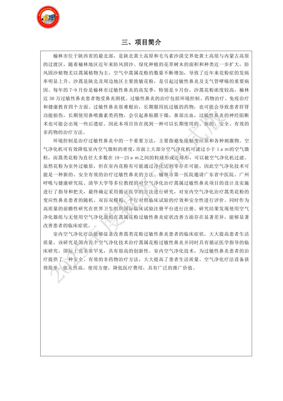 | 提名单位意见: | 榆林地区近几年过敏性鼻炎鼻炎高发,与周围毛乌素沙漠中生长着大量的蒿属植物有关,沙蒿花粉是陕北及周边地区的主要致敏花粉,是引起过敏性鼻炎及支气管哮喘的重要病因,榆林近30万变应性鼻炎患者饱受鼻炎困扰,严重影响了正常的工作、学习和生活。为了给过敏性鼻炎患者提供一种安全、有效的治疗方法,该项目围绕蒿属花粉过敏性鼻炎患者开展研究,采用室内净化技术创造低密度甚至零变应原的环境的原理,使患者非全天暴露于变应原成为可能,从而改善过敏性鼻炎患者症状。该项目作为高质量的前瞻性研究在世界卫生组织国际临床试验注册平台进行注册。在临床试验设计方面得到了广东省中医院、广州呼吸与健康研究院、清华大学等多位教授的指导。为本研究的高质量、高水平提供了一定的保障。研究结果发现室内空气净化疗法能够显著改善蒿类花粉过敏性鼻炎患者的临床症状,大大提高患者生活质量。该研究是国内首个空气净化技术治疗蒿属花粉过敏性鼻炎并同时具有循证医学指导的临床研究,国际上也非常罕见,具有很高的创新性。室内空气净化治疗蒿属花粉过敏性鼻炎,为过敏性鼻炎患者的治疗提供了一种安全、有效的治疗方法,是过敏性鼻炎防控的一个新方向;空气净化疗法设备获得简单,依从性高,使用方便,降低医疗费用,具有广泛的推广价值。 |