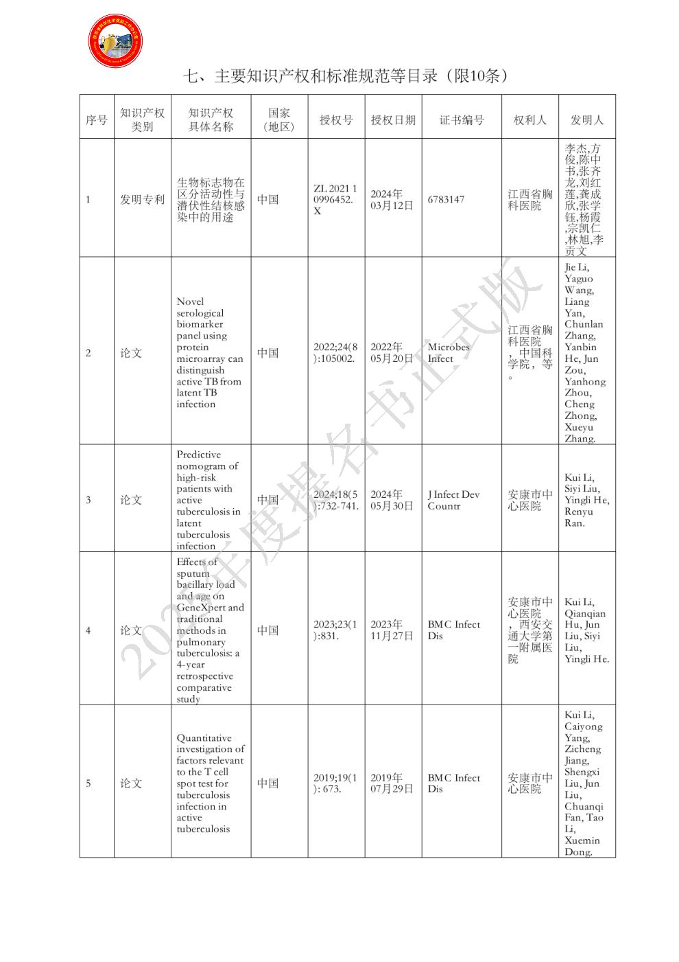 排名:2 行政职务:科室负责人 技术职称:副主任医师 工作单位:江西省胸科医院 对本项目技术创造性贡献:负责研究项目技术方案的设计、组织协调及实验安排、论文撰写、统计分析、模型构建和发明专利申请等。对“四、主要科技创新”创新点一、四有主要贡献。是发明专利的第一发明人,3篇SCI论文的第一作者。独立于合作者的贡献程度:40%,证明材料见必备附件1、2,其他附件7、8。 曾获国家科技奖励情况: 主持国家自然科学基金项目1项、省科技厅重点研发项目1项、国家发明专利3项,其中1项成果鉴定为国内领先;发表SCI论文7篇,核心类5篇。 - 姓名:冉仁玉