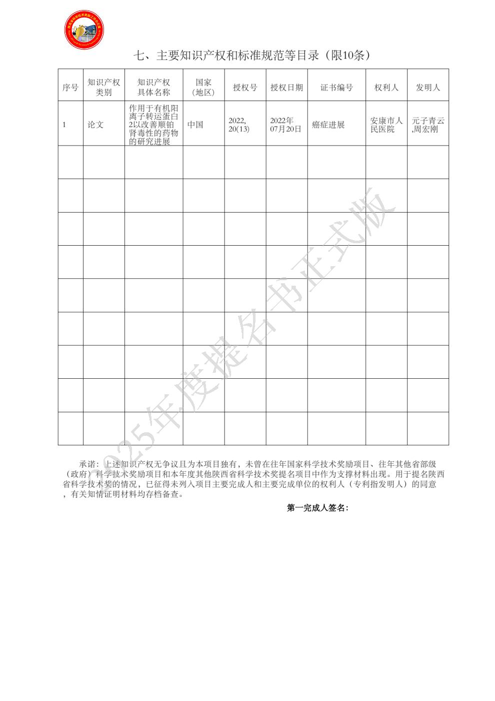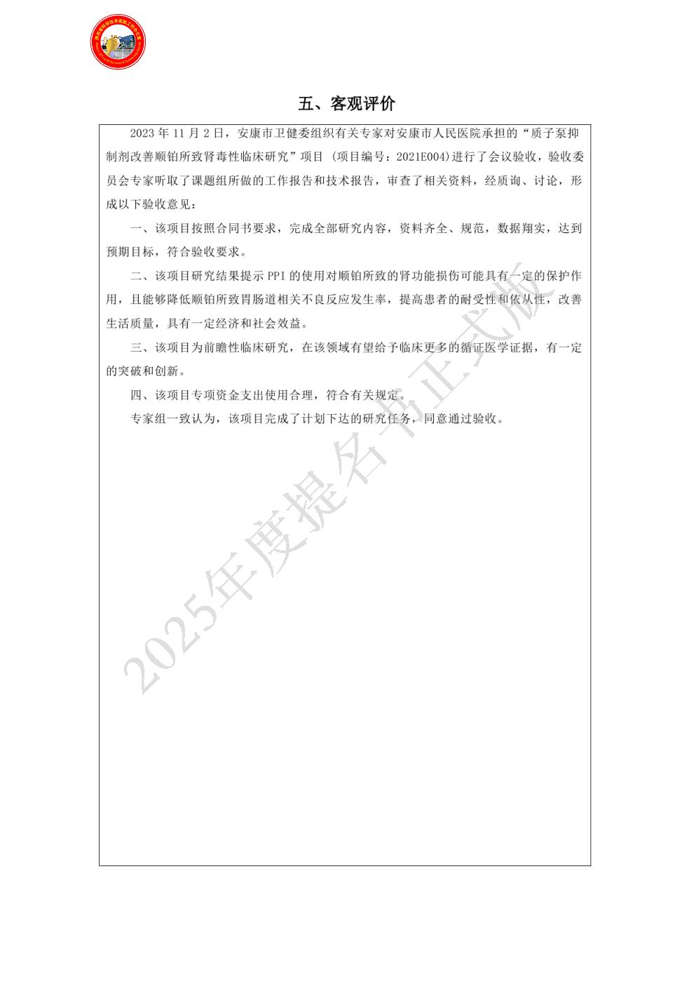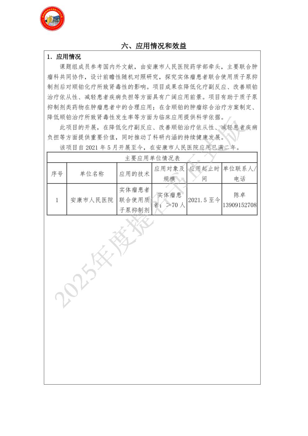 | 主要完成单位及创新推广贡献: | - 单位名称:安康市人民医院