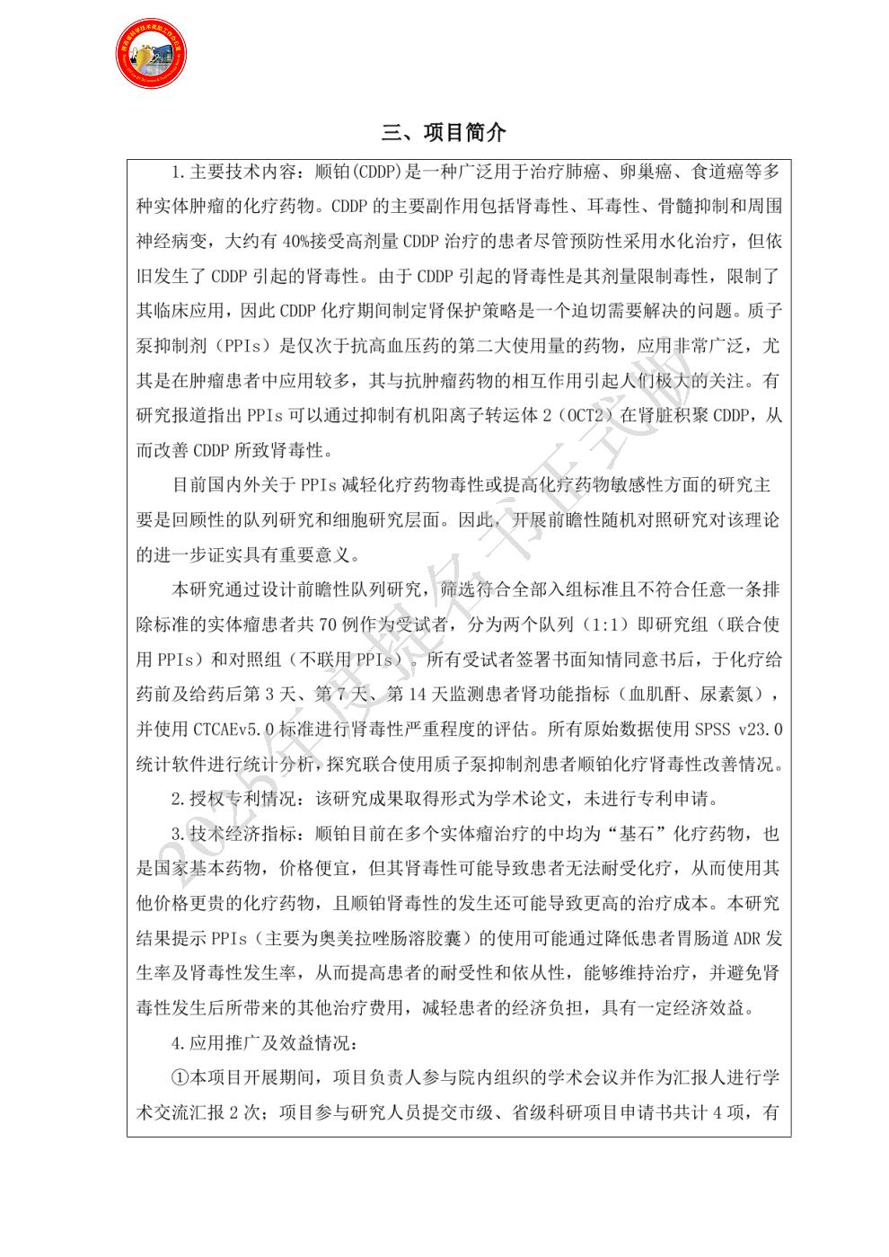 | 提名单位意见: | 该项目《质子泵抑制剂改善顺铂所致肾毒性临床研究》通过设计前瞻性随机对照研究,探究实体瘤患者联合使用质子泵抑制剂后对顺铂化疗所致肾毒性的影响。项目成果在降低化疗副反应、改善顺铂治疗依从性、减轻患者疾病负担等方面具有广阔应用前景。项目有助于质子泵抑制剂类药物在肿瘤患者中的合理应用;在含顺铂的肿瘤综合治疗方案制定、降低顺铂治疗所致肾毒性发生率等方面为临床应用提供科学依据。