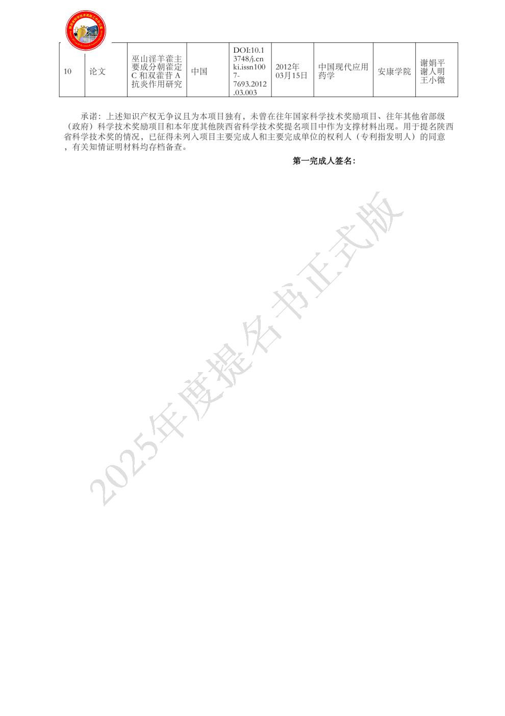 经审查,项目相关信息已完成提名公示,公示结果无异议。我单位认真审阅了申报材料及完成人资格,确认申报材料真实有效,相关栏目填写符合要求。同意提名该项目为陕西省科学技术进步二等奖。 |