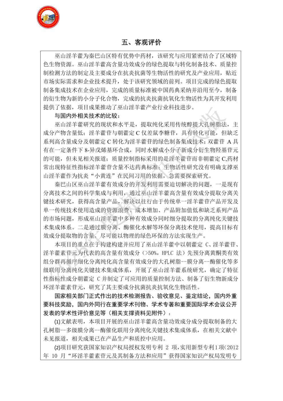| 提名单位意见: | 该项目是在陕西省科技厅立项项目和安康学院自选项目完成中取得的成果。项目基于大孔树脂--多级膜分离--酶催化联用的巫山淫羊藿高含量功效成分制备关键技术集成体系及应用在国内外相关文献中未见报道。项目成果在巫山淫羊藿高含量功效成分制备、分离、质量控制及产品开发等方面具有广阔应用前景。研究构建的的多种分离分析技术联用集成体系,适用于中药材中多种功效成分的高效提取制备,应用前景广阔。研究建立的质量检测方法和探索的生物活性对巫山淫羊藿深度开发和提高附加值具有重要的意义。项目成果在企业生产中获得推广应用,为淫羊藿提取物制备、质量控制、生物活性研究及新产品开发奠定了坚实基础,促进了安康中药材资源开发产业的技术升级,推动了国内生物医药产业行业科技进步。