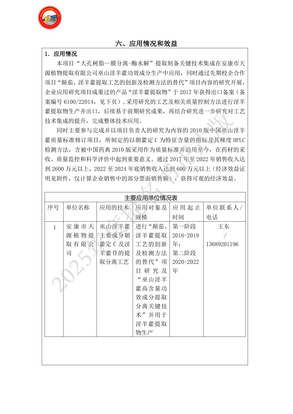 单位贡献:作为本项目的第二依托单位,安康市天源植物提取有限公司为项目的顺利完成并取得突出成果做出了重要贡献,表现为:1)为项目的顺利实施提供了人力资源与优质的工作环境与场所;2)在项目的原药材收集、产业化工艺研发及生产应用中起到了重要作用。