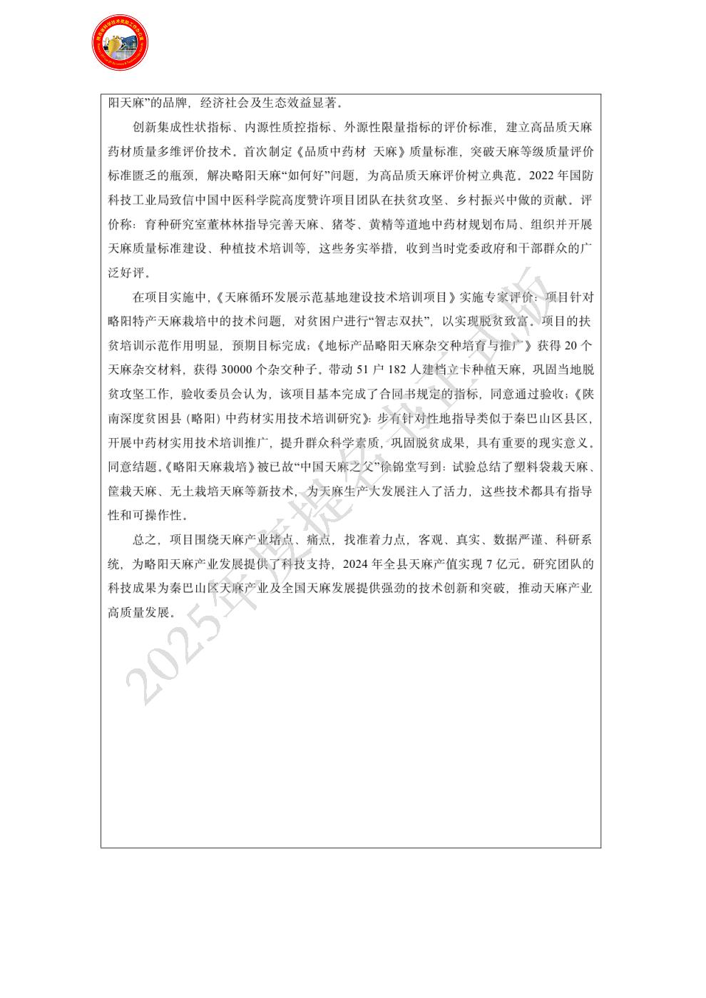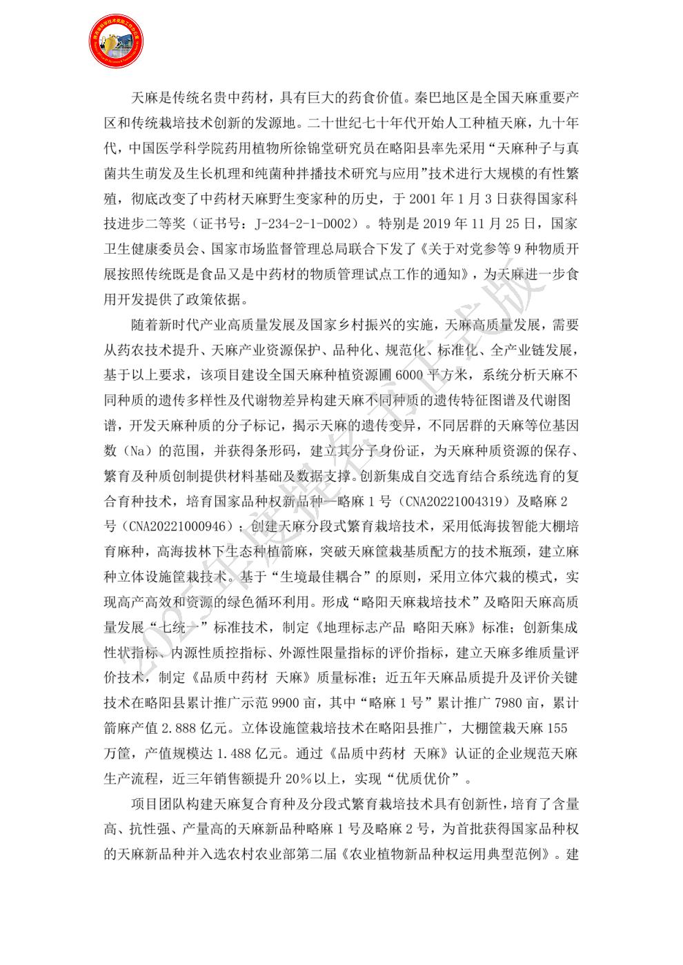 | 主要完成单位及创新推广贡献: | - 单位名称:略阳县中药材产业发展服务中心(略阳县天麻研究所)