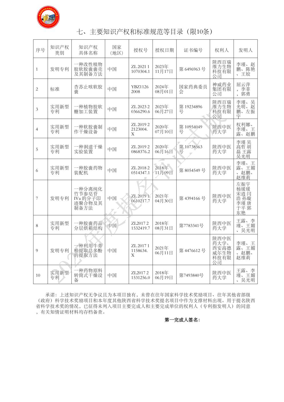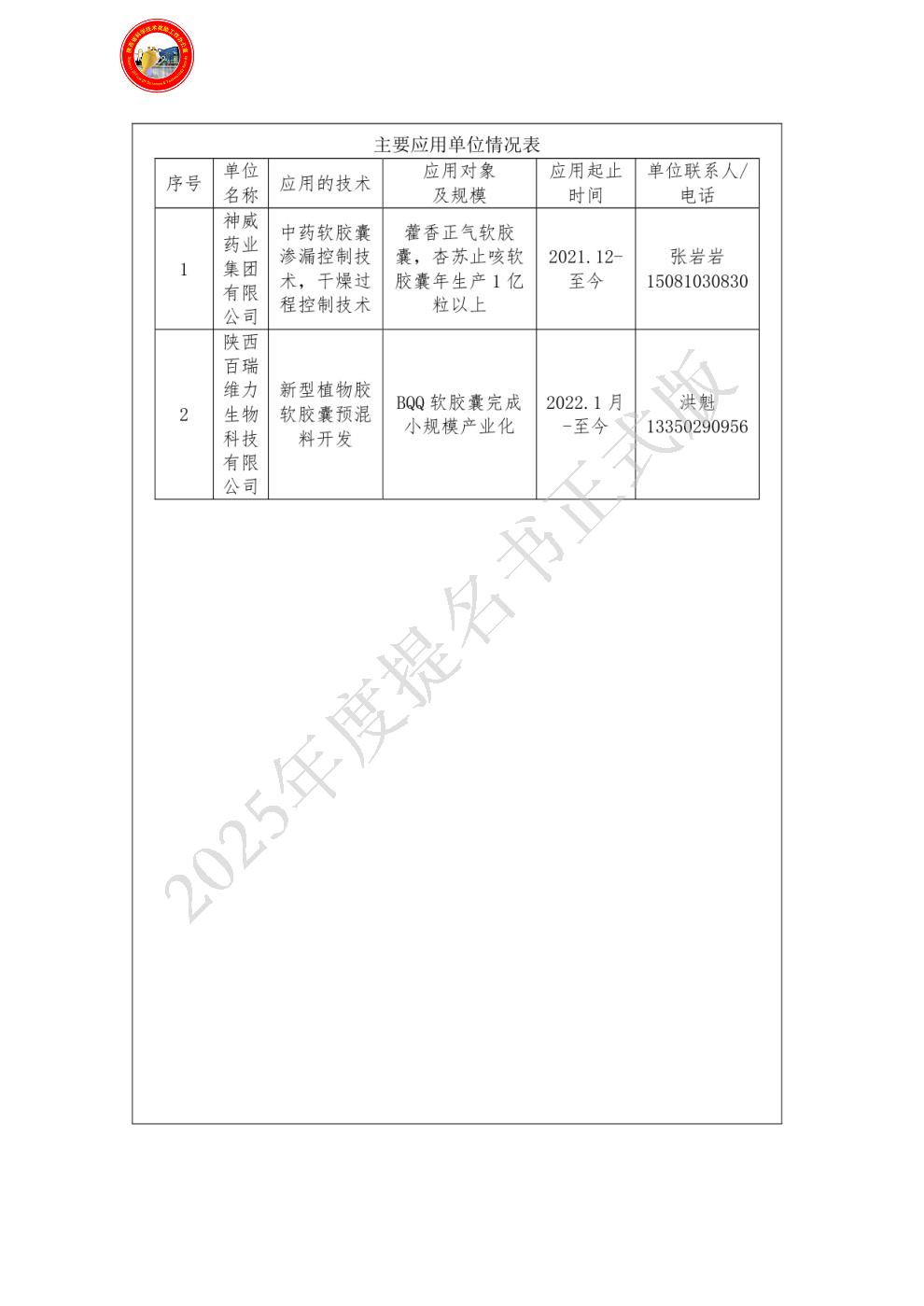排名:2 行政职务:无 技术职称:副教授 工作单位:陕西中医药大学 对本项目技术创造性贡献:负责植物胶改性研究及软胶囊质量分析 曾获国家科技奖励情况:(1)中药软胶囊剂型改进开发与应用,2024年陕西高等学校科学技术研究优秀成果奖(二等),第2完成人;2024.6