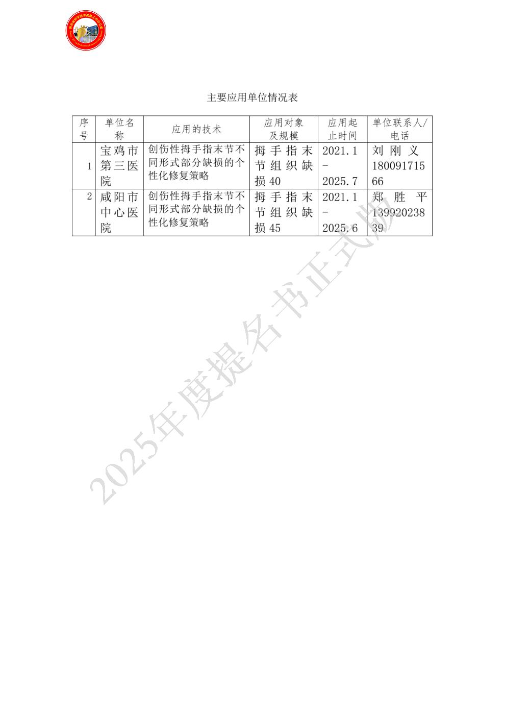 单位贡献:兵器工业卫生研究所负责本项目设计、研究、实验、申报全过程。本项目通过过纳入及排除标准筛选出创伤性拇手指末节基底部以远不同形式部分缺损病例,根据首创的创伤性拇手指末节部分缺损的分型,具体量化创伤性拇手指末节部分缺损的程度,分别采取相应的个性化治疗重建策略,达到"缺什么,补什么;缺多少,补多少"的生理修复原则及修饰性再造要求。术后通过标准、程序化的治疗及随访,总结、细化、完善创伤性拇手指末节不同形式部分缺损的分型及相应的个性化治疗策略,针对不同类型的创伤性拇手指末节部分缺损,建立一套完善、标准、个性化的修复重建策略及效果评价体系。该项目技术的推广应用,具有良好的社会及经济效益。该项目已在咸阳市中心医院、宝鸡市第三医院等单位进行推广。经实践检验,该项目有很好的实用性,有广阔的应用前景,它的推广应用使更多患者收益,并将使我国显微外科修复技术得到进一步推广。