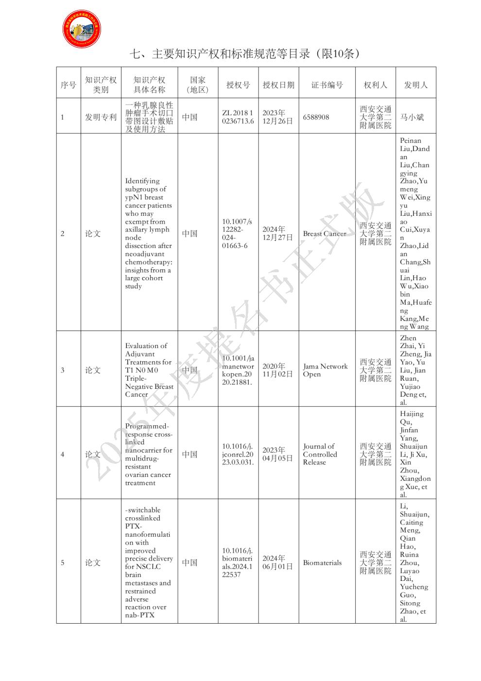 排名:1 行政职务:无 技术职称:副主任医师 工作单位:西安交通大学 对本项目技术创造性贡献:1、设计课题方向,创新乳腺癌重建术式并推广应用。