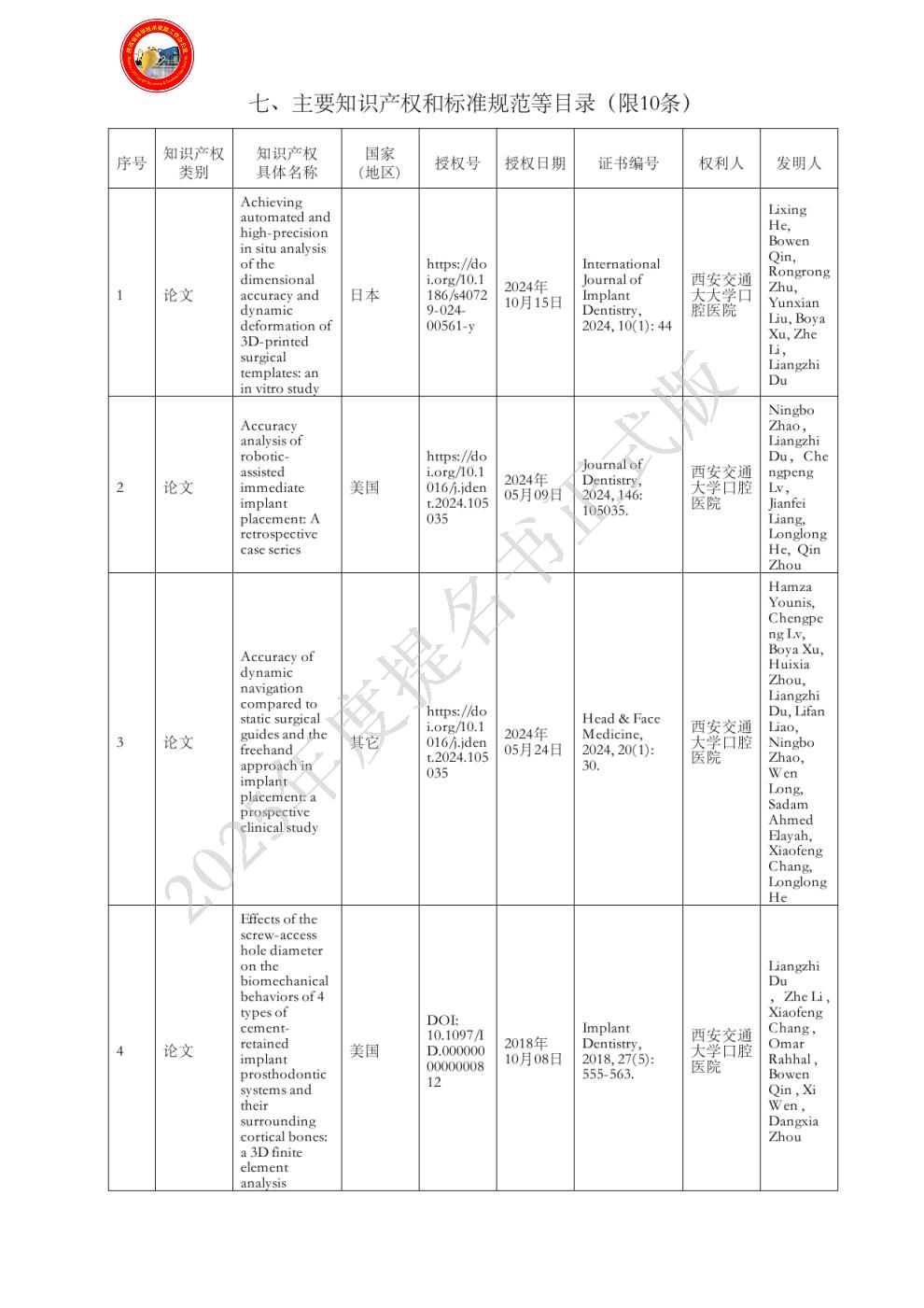 排名:10 行政职务:数字化种植修复科主任助理 技术职称:主治医师 工作单位:西安交通大学口腔医院 对本项目技术创造性贡献:项目骨干成员,负责收集数字化关键技术相关的临床病例并且整理原始数据,研究数字化种植上部修复方面的。在国内外学术期刊发表学术论文多篇。对本项目主要知识产权和标准规范等目录7贡献。 曾获国家科技奖励情况:无