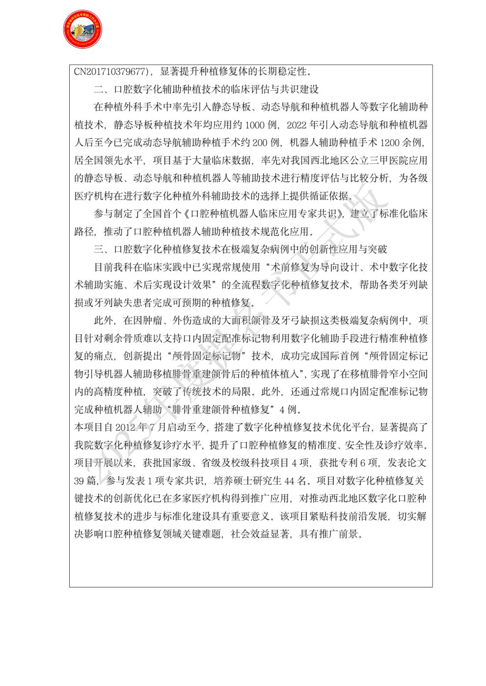 应用效果与行业作用: 累计完成数字化种植修复超3万例,机器人年完成量全国第一,推广至30余家机构,无严重并发症。近三年直接经济效益约300万元。通过教学培训培养专科医师,显著提升西北地区口腔数字化水平,具有重要行业示范意义。 |